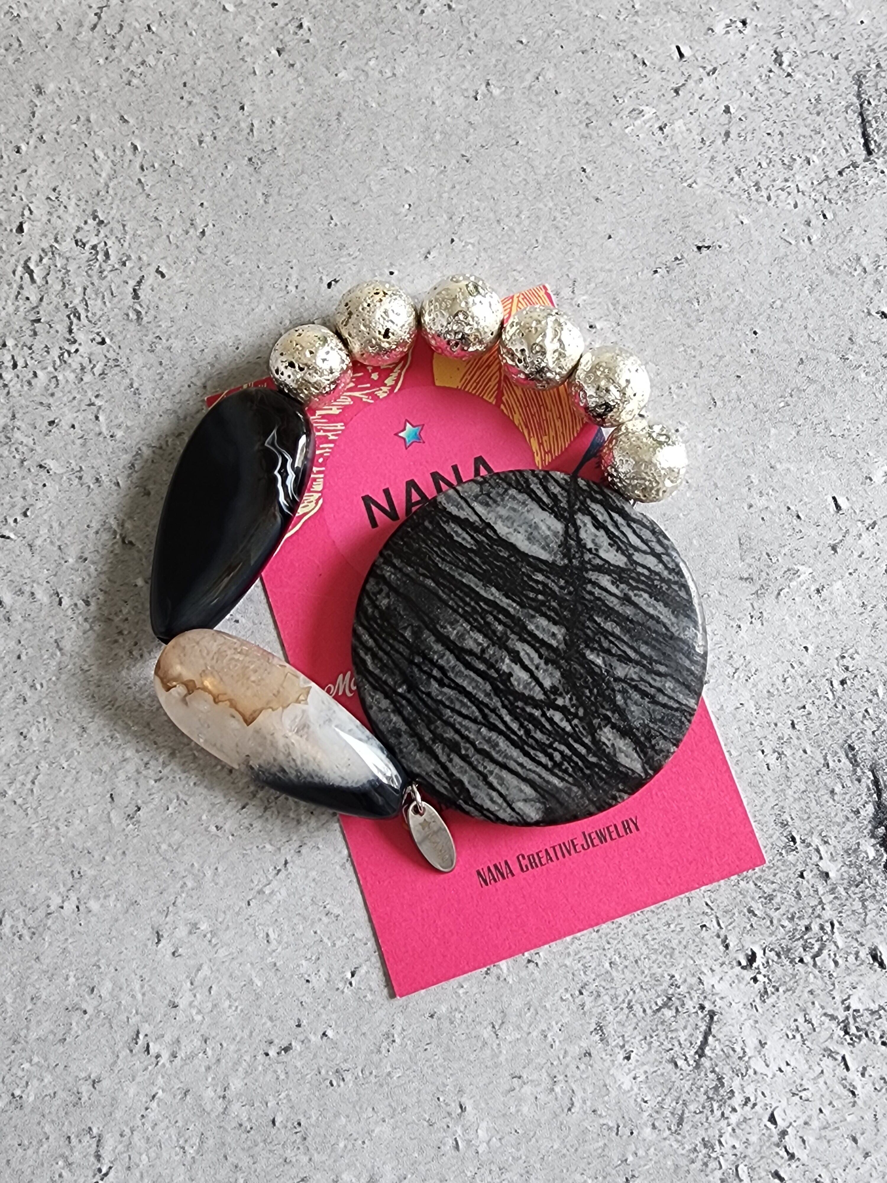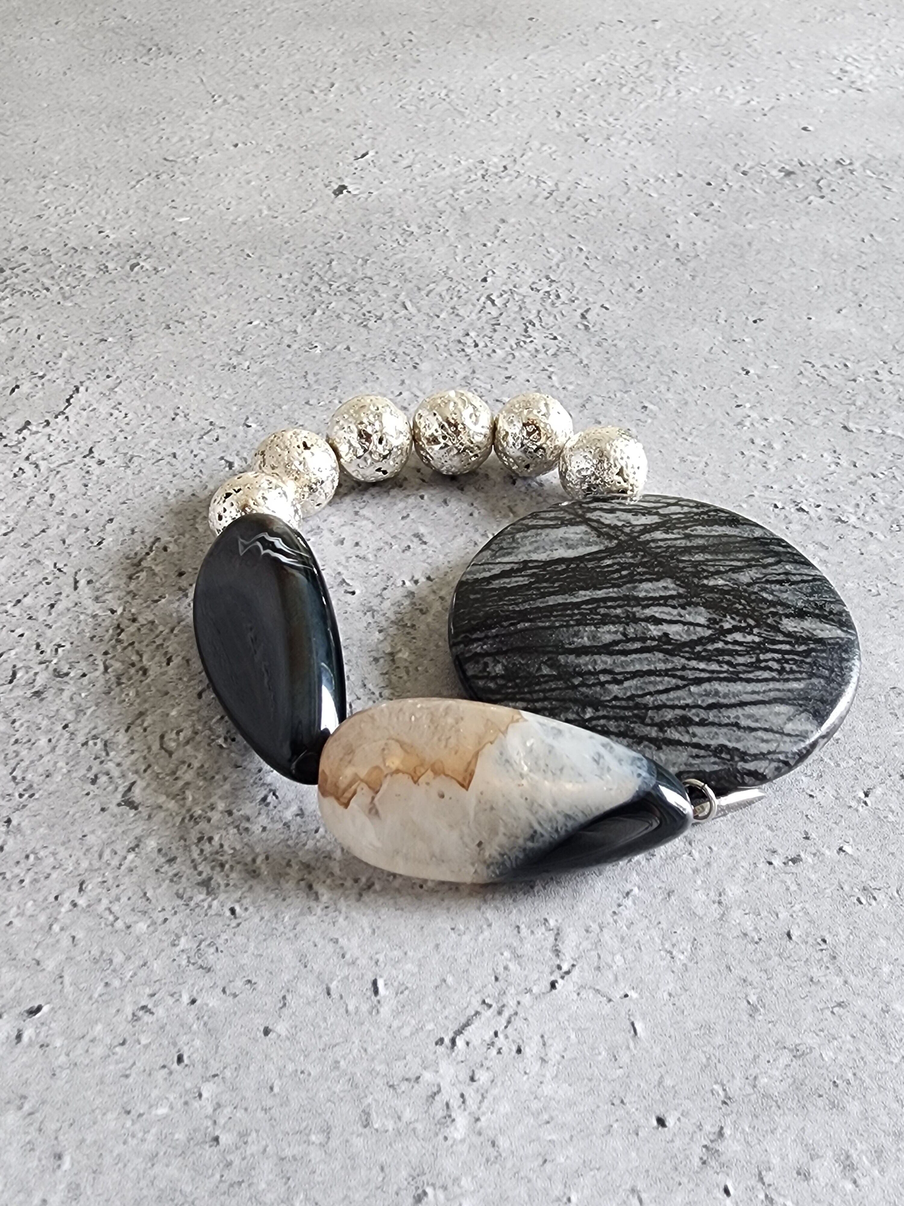 インパクト絶大な大きいサークル形ロードナイト、シルバーコーディングの溶岩石と雫形オニキスのモノトーンブレスレットです。