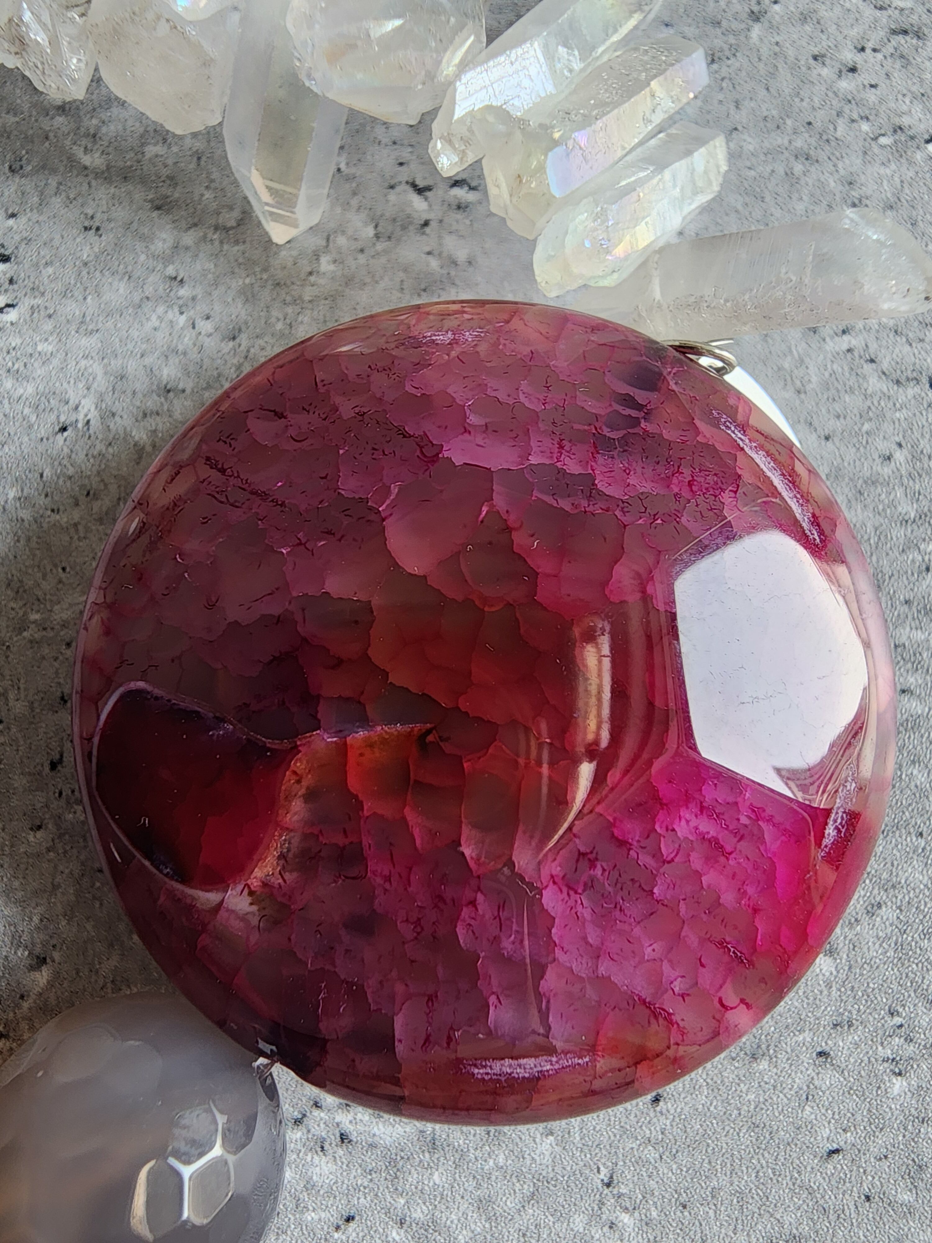 強烈なインパクトで目を惹き付けるレッドピンクカラーファイヤーアゲートを上品な輝きを放つグレーオニキスとABコーティングのクリスタルを合わせて。