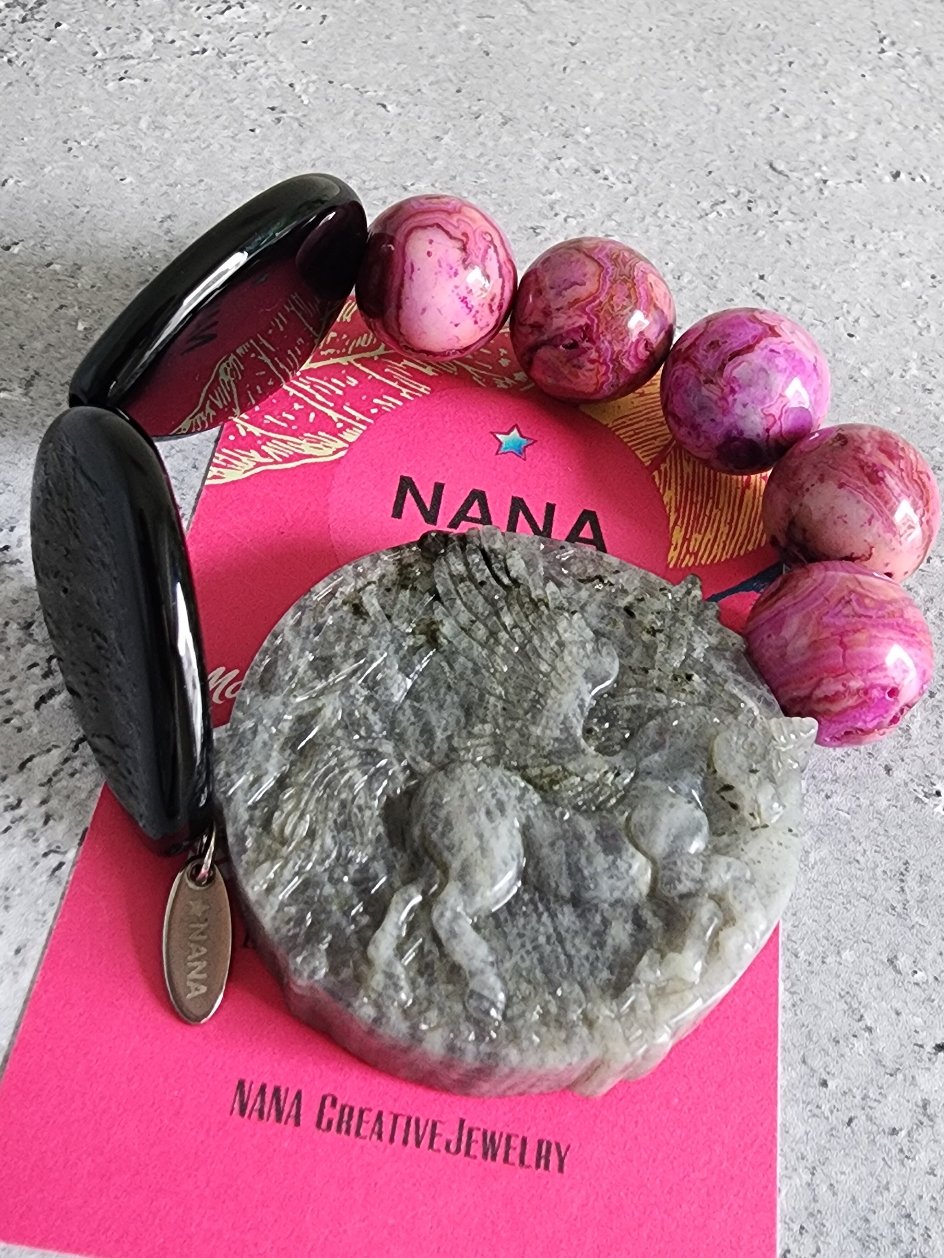 神秘的なピンクシラーによってエキゾチックな美しさのラブラドライトプレートに繊細に彫刻されたユニコーン。まるでファンタジーの世界から飛び出したかのように生き生きとして、持ち主の守護神として大きな浄化と保護のパワーを発揮してくれます。