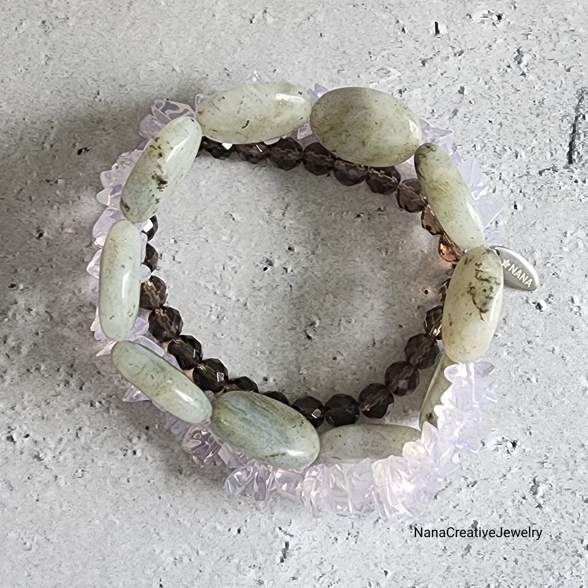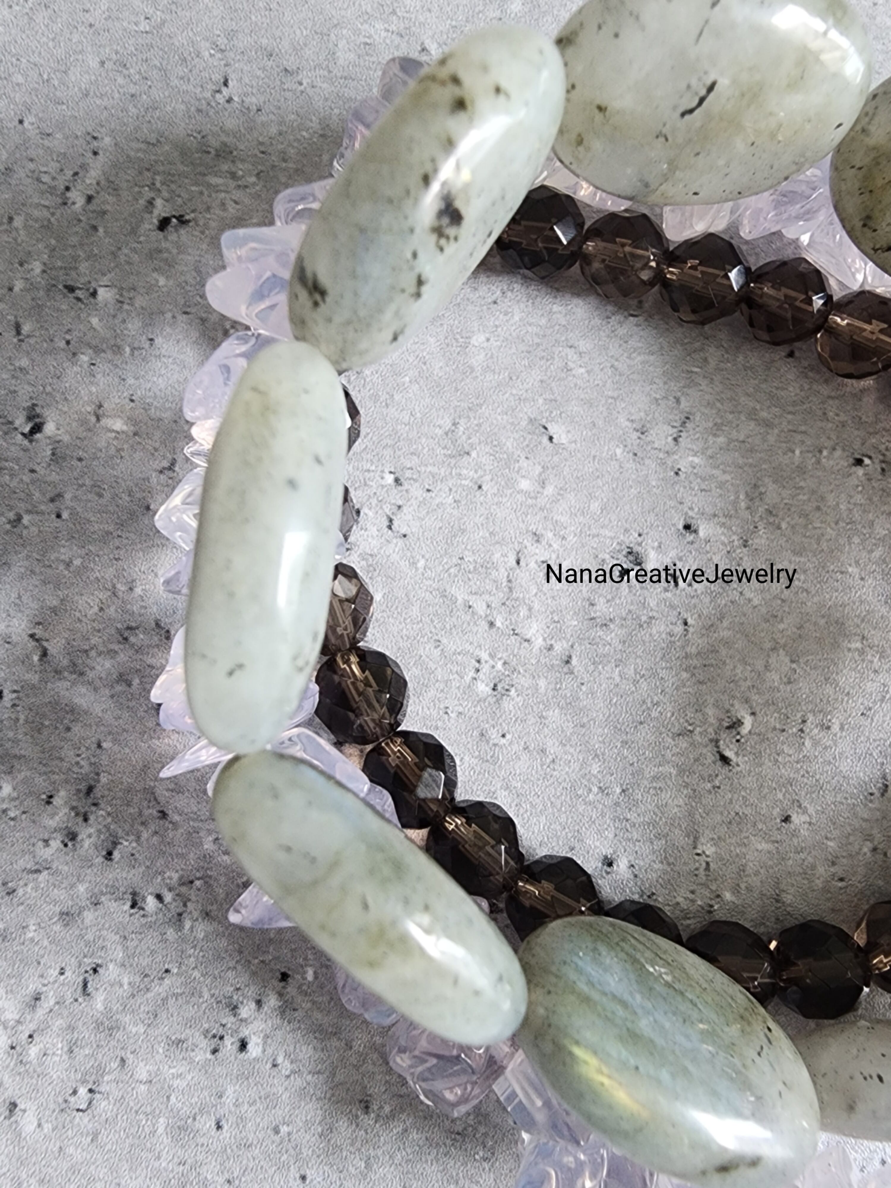 ラブラドライト、スコロライト、スモーキークォーツ三種類の天然石を贅沢に組み合わせたシックなムードのアイテムです。