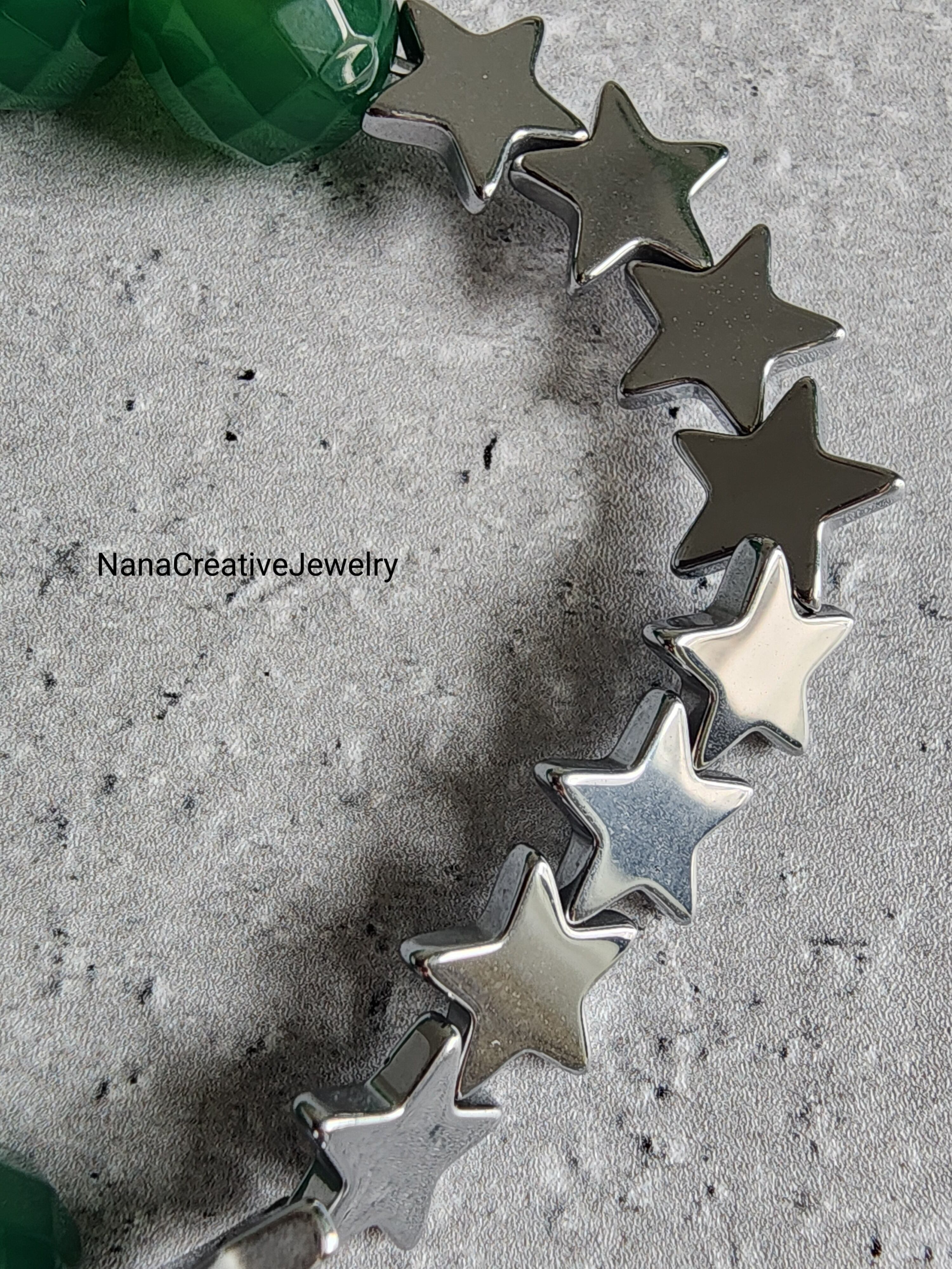 涼しげな森のようなグリーンカルセドニーの64面カットとヘマタイトスターのシンプルでかわいらしいブレスレットです。