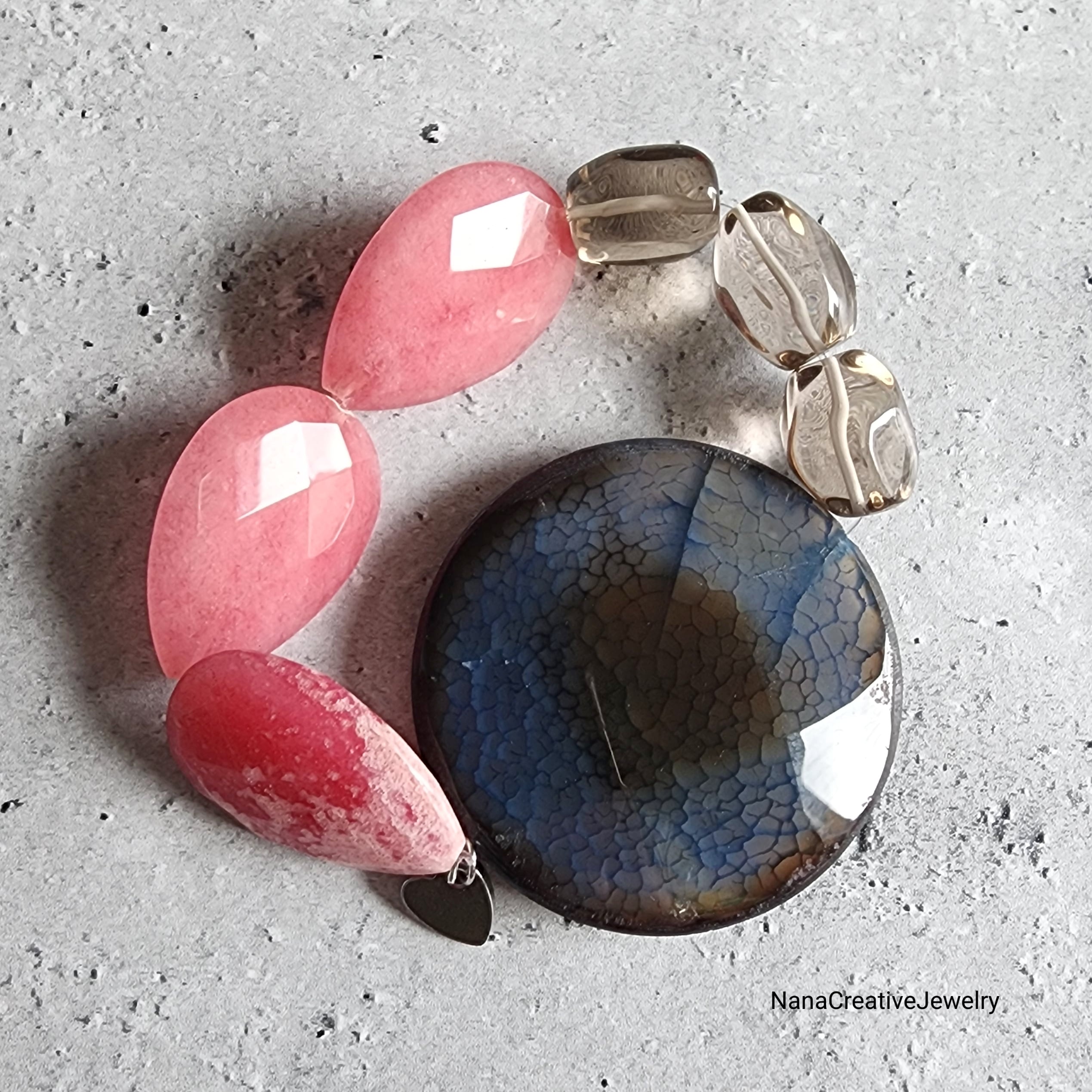 人気な大粒ファイヤーアゲートと甘いムードのピンクアベンチュリンにクリア度が高いスモーキークォーツタンブルが織り成すインパクト強い、印象的なアイテムです。
