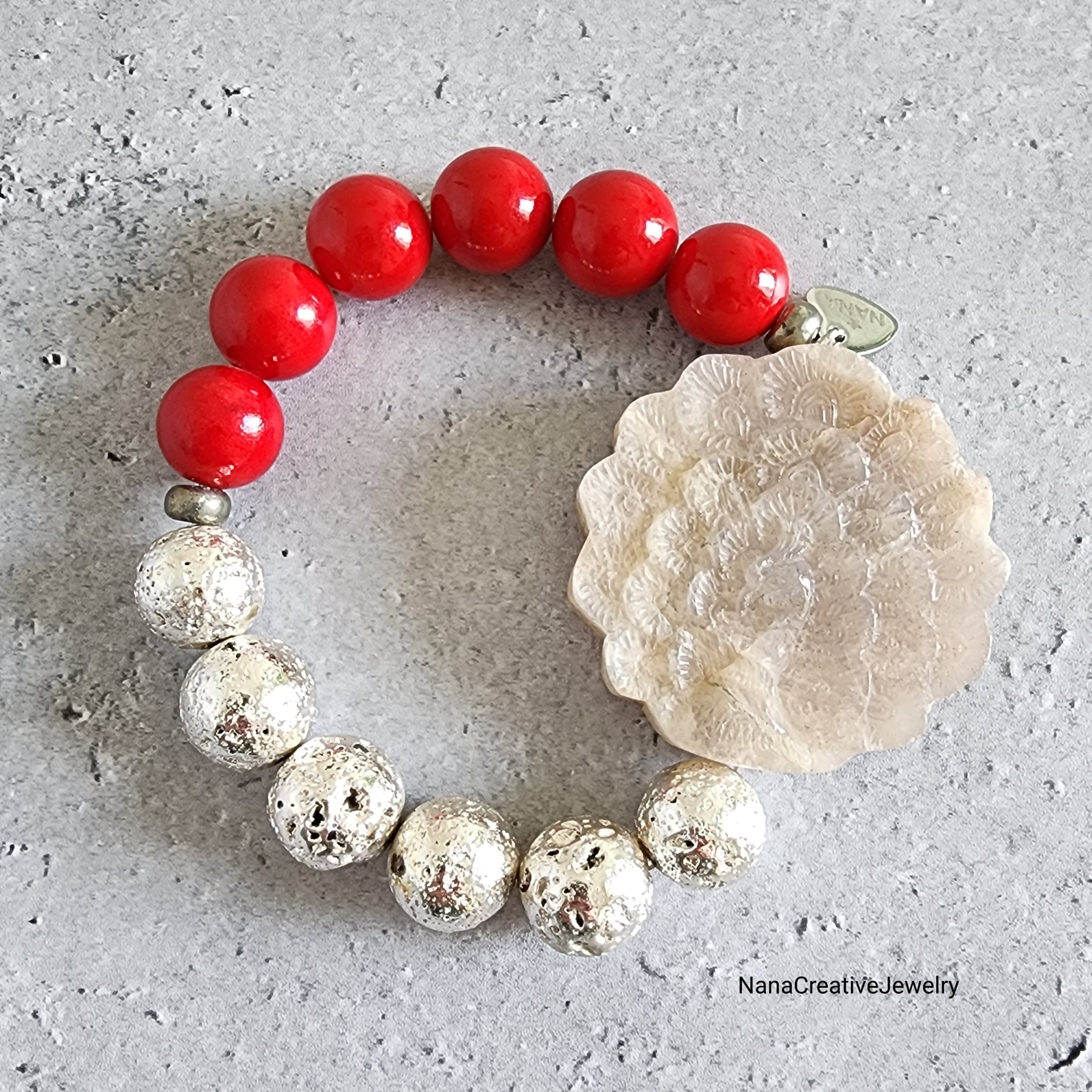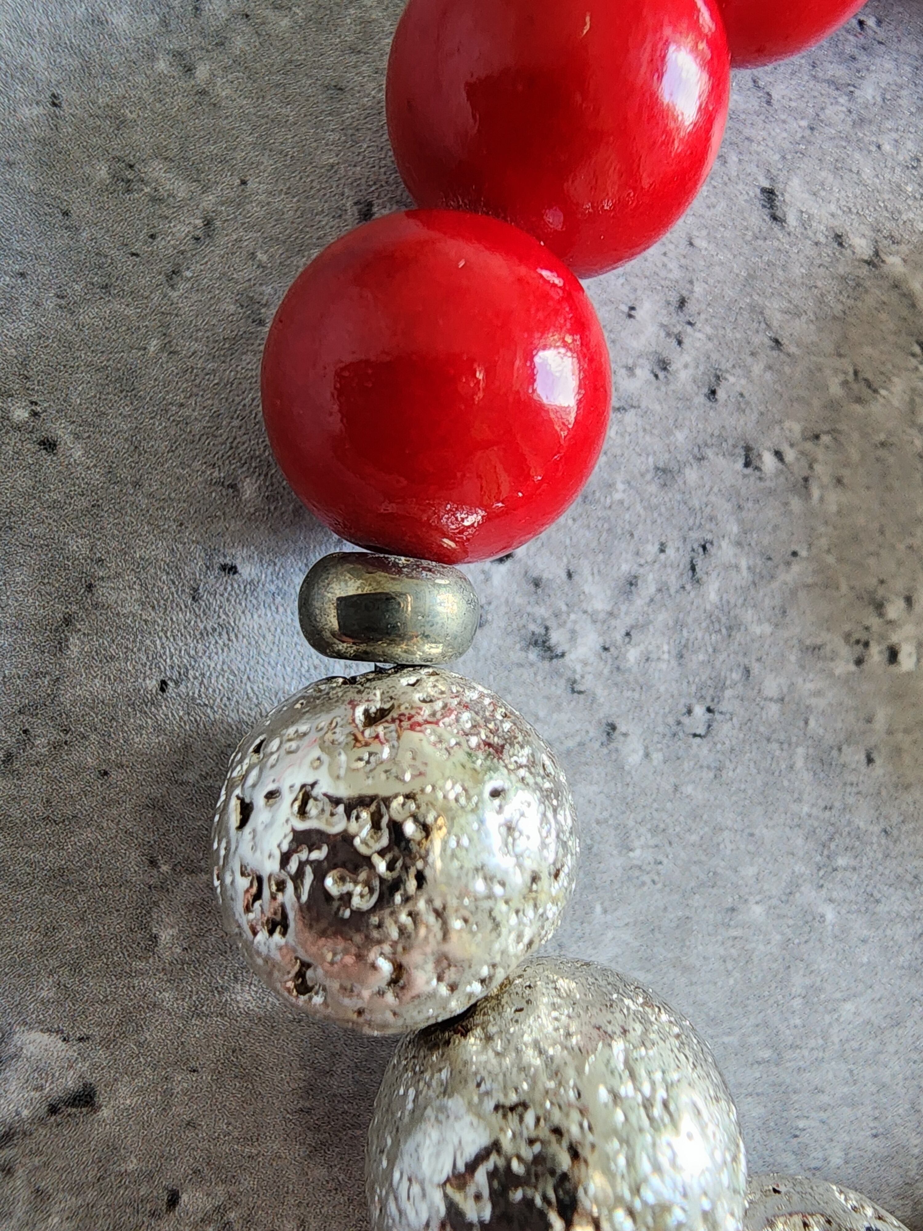 今回はより華やかに、ロマンチックなムードを醸し出すため、まっ赤なアゲートとメタルチックな光沢が上品なラバーストーンを合わせて見ました。レッドアゲートをくっきりと強調したかったので、両側に小さいヘマタイトロンデルを入れました。