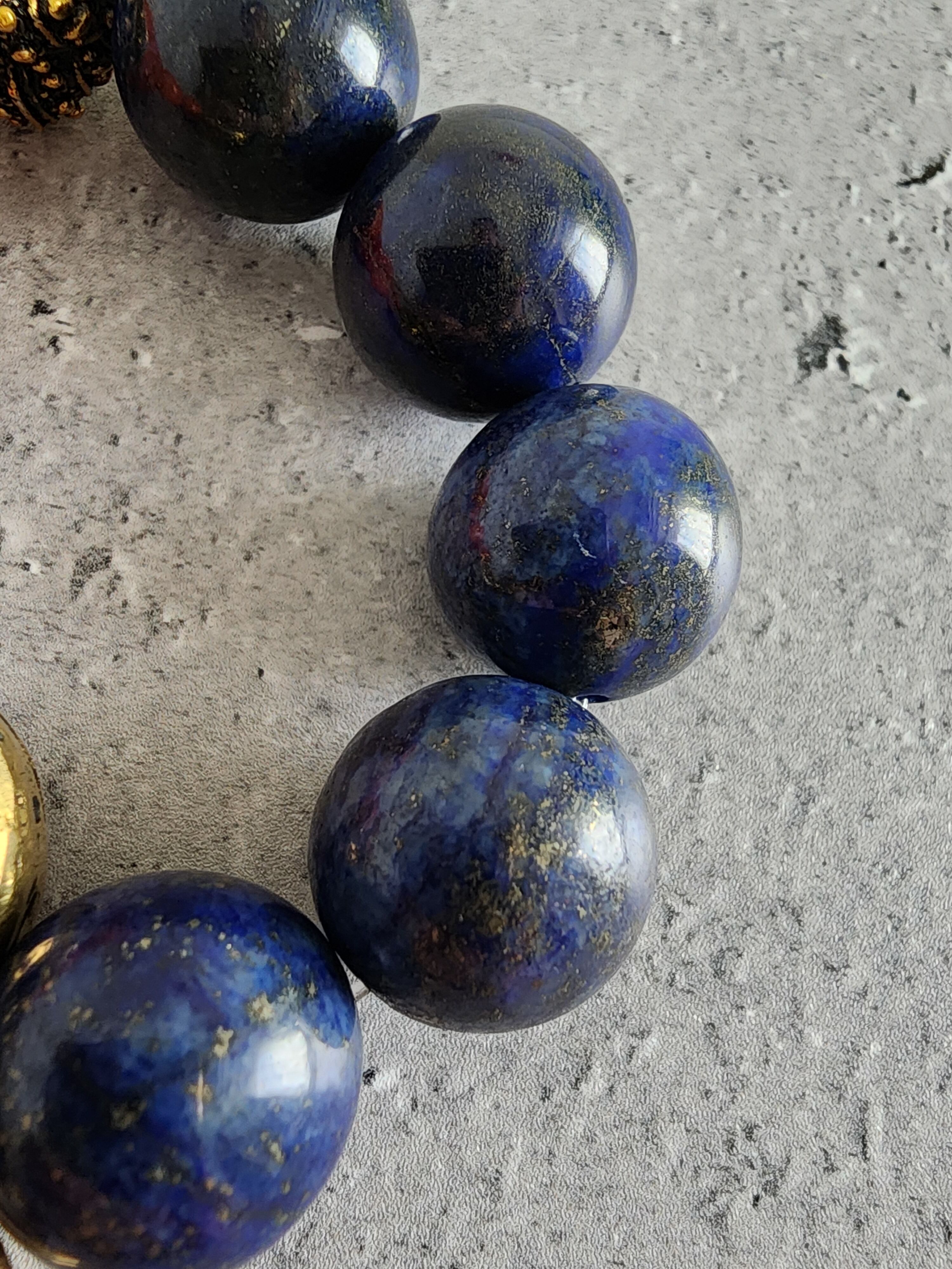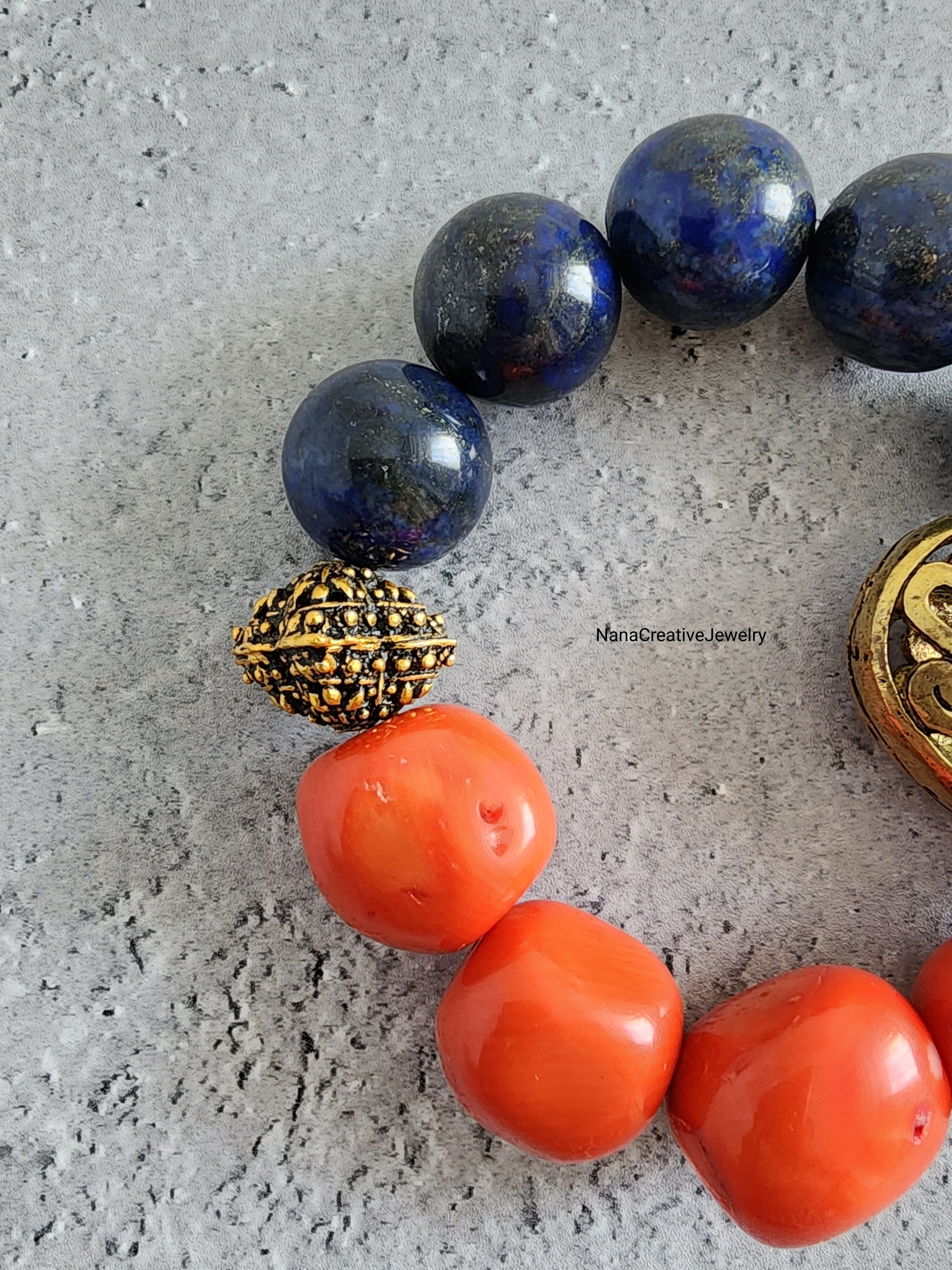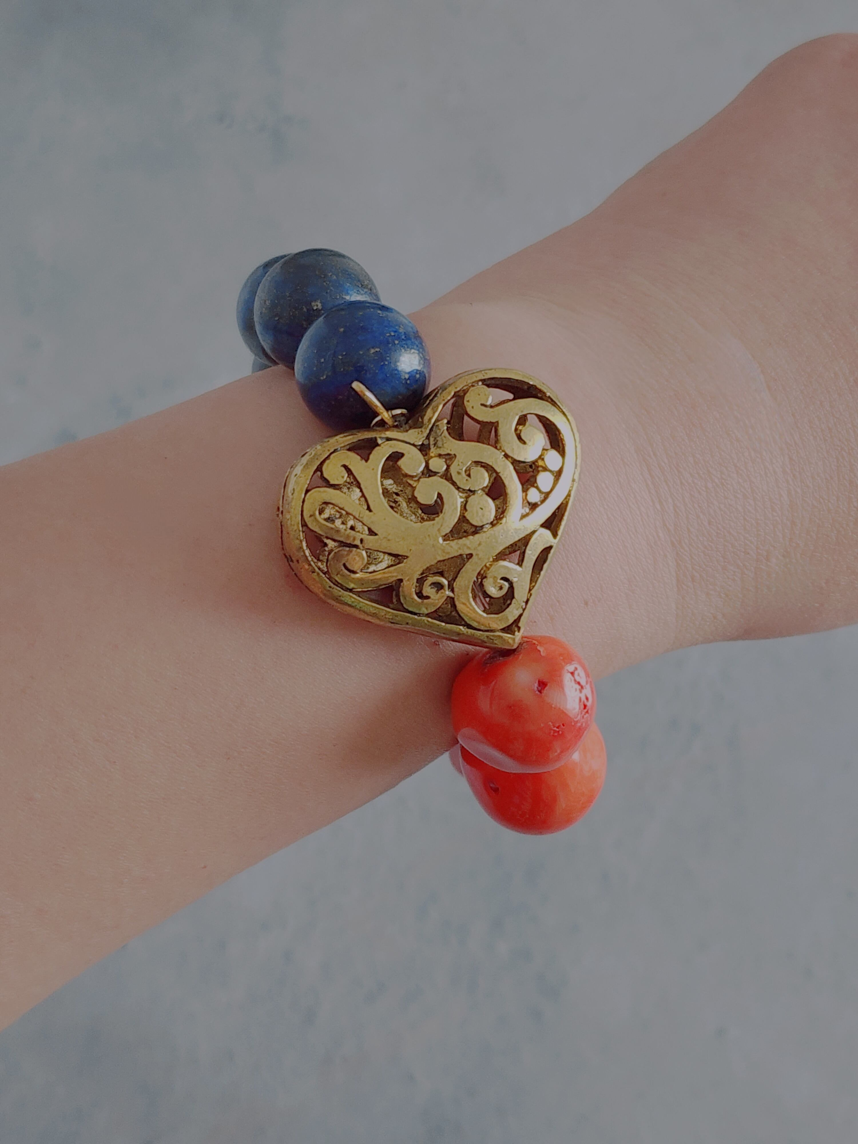 ラピスラズリと鮮やかなオレンジカラーコーラルが見事に調和し、繊細なデザインの真鍮製ハートが中央に輝きを添えるアンティーク調のブレスレットです。