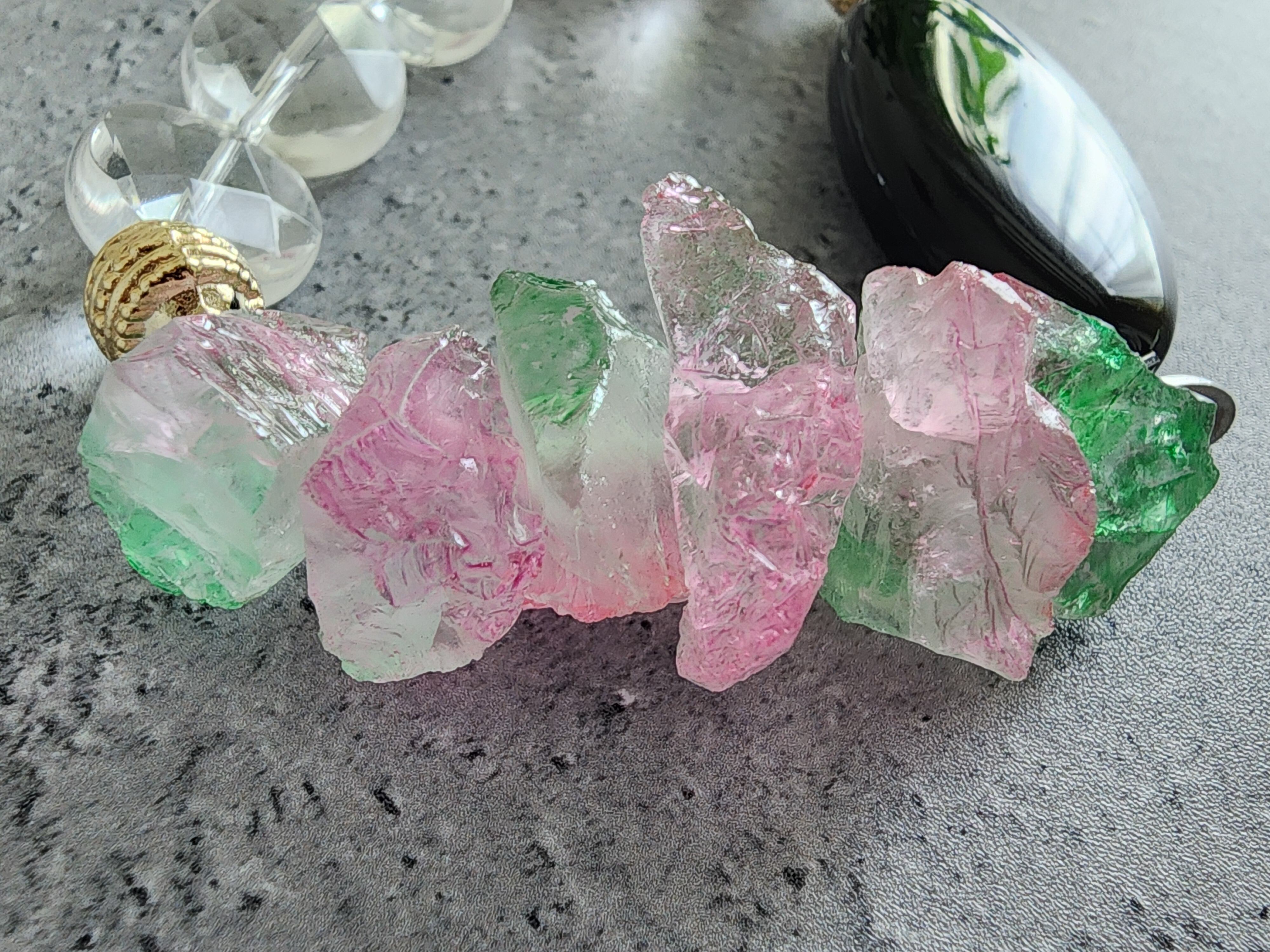 ファセットカットされたコイン型のクリスタルは光を受けてキラキラと輝き、ゴールドカラーの金属ビーズは全体のデザインに高級感を加え、柔らかな質感とパステルカラーの優しい色合いが華やかさを添えるアイテムです。