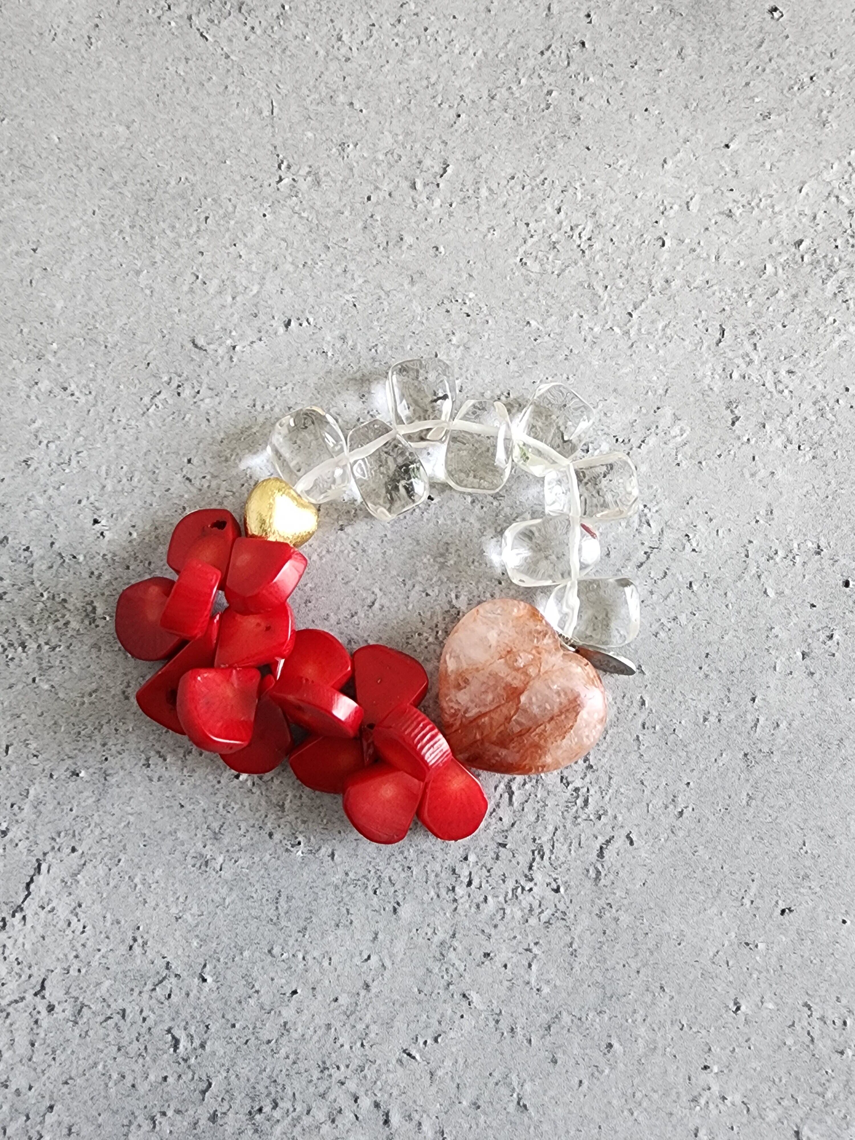 透明感あふれるヘマタイトインクォーツ、情熱的なレッドコーラル、温かみのあるコッパーのハート、そして透明度が高く堂々と光を受け入れ、強く輝くクリスタルが織りなす美しいハーモニー。