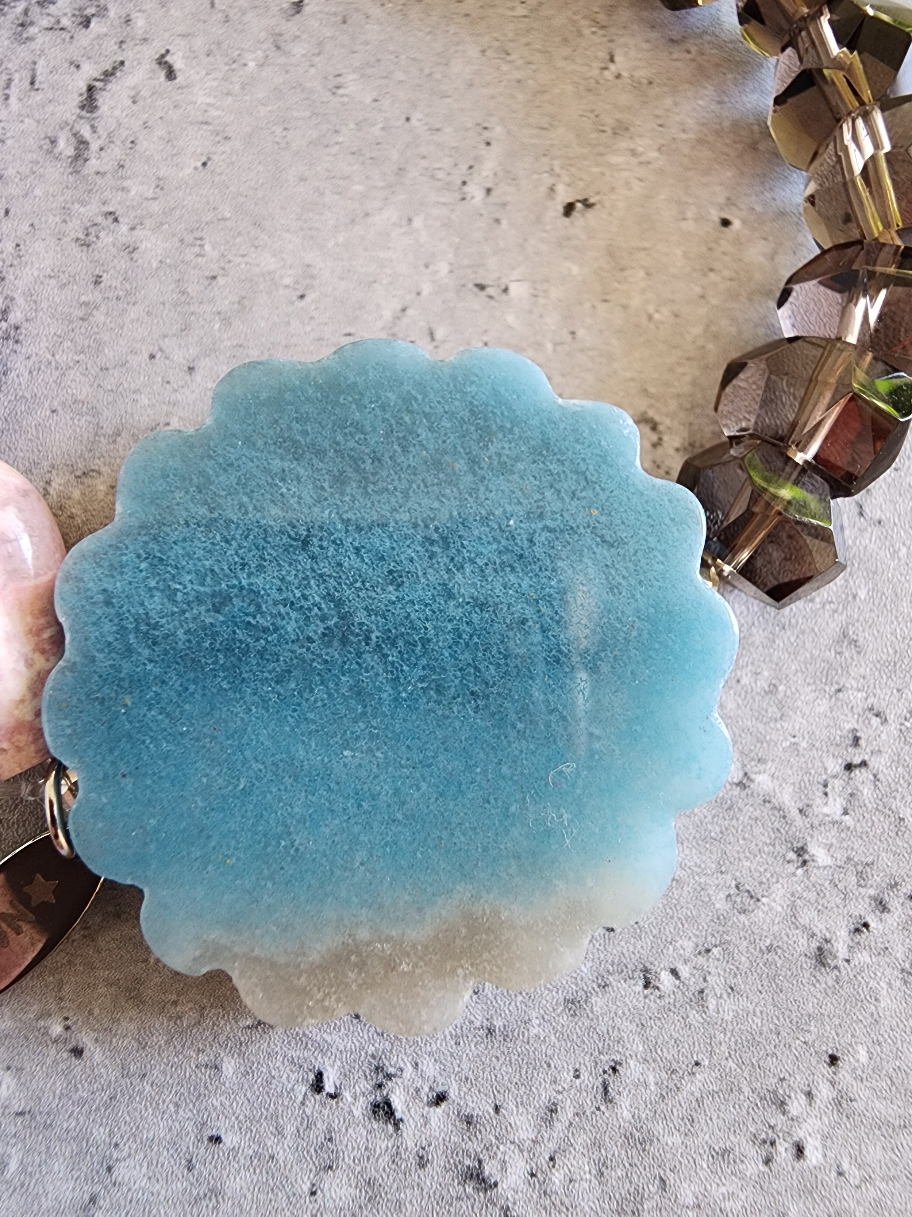 トロレアイトの独特な色合いも魅力的で、鮮やかな水色と半透明のグレー、白色の内包物の3色で構成されています。