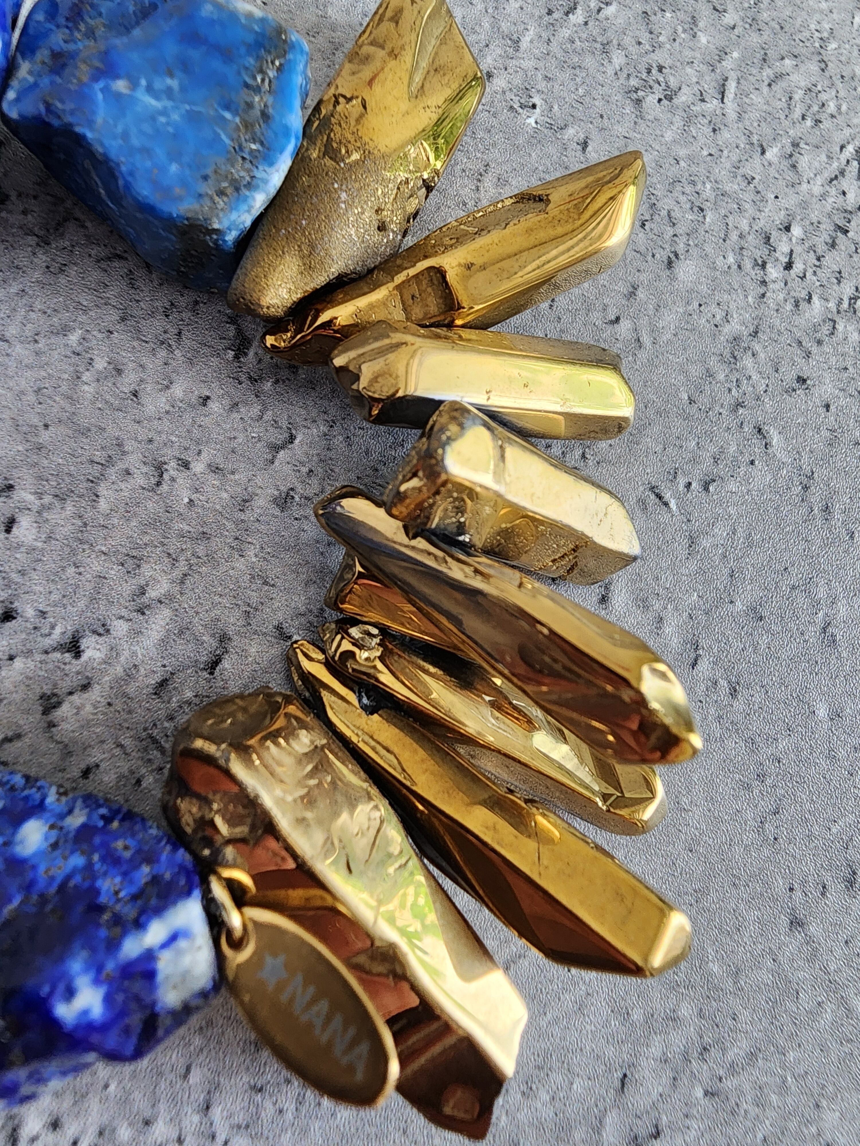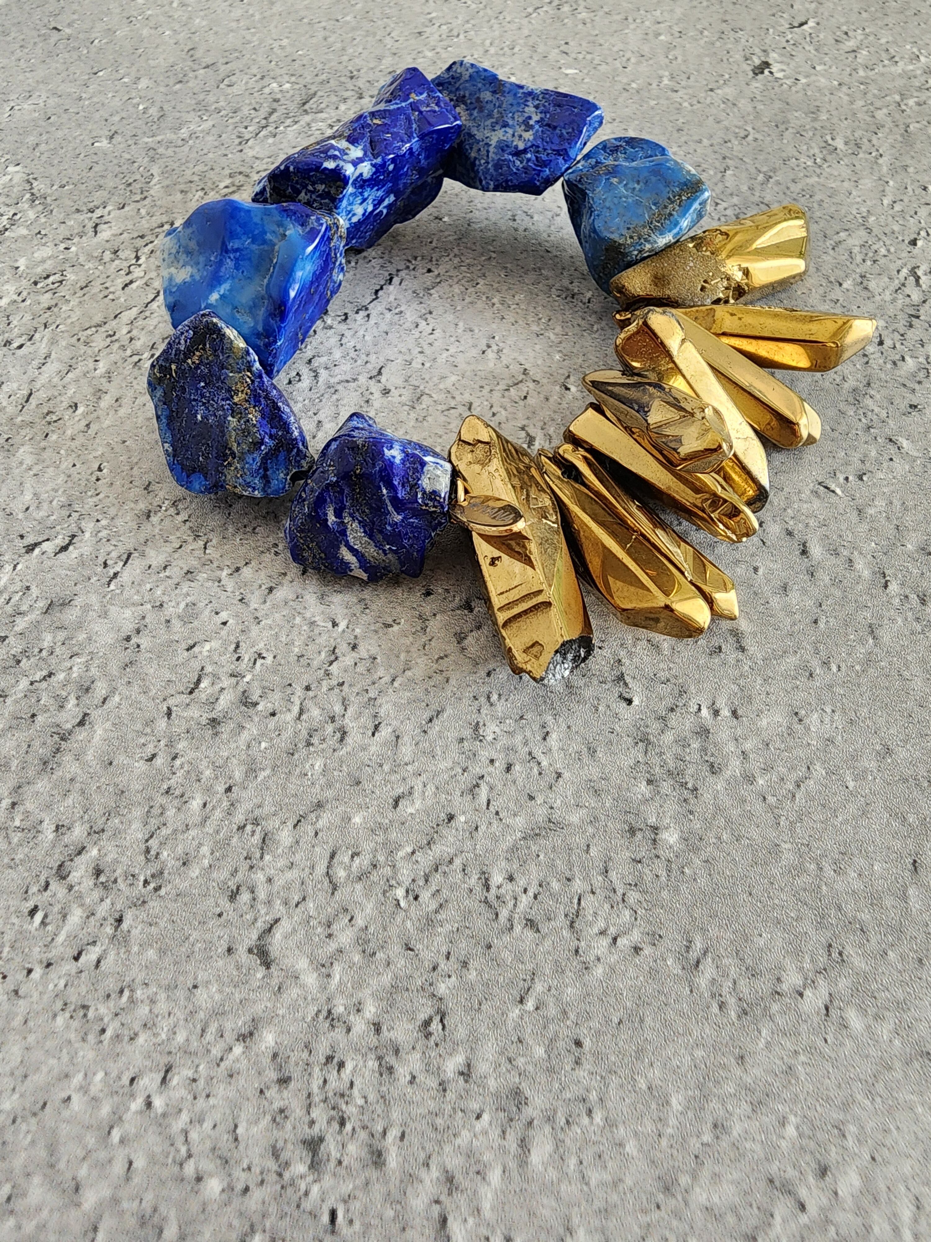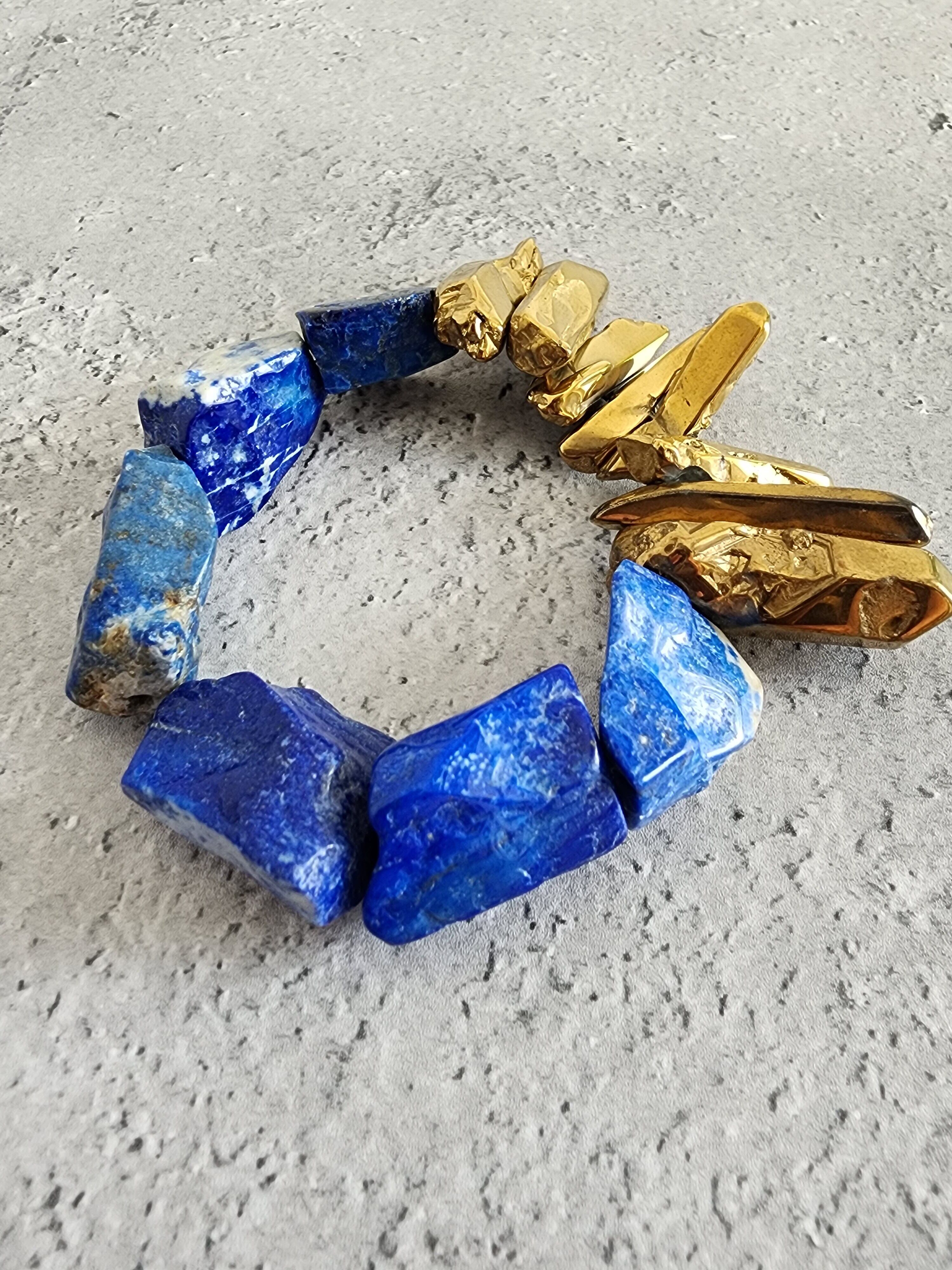 原石の姿をそのまま残したラピスラズリとゴールドコーティングクリスタルの野性的な雰囲気と華やかな色合いがチャーミングな一本です。