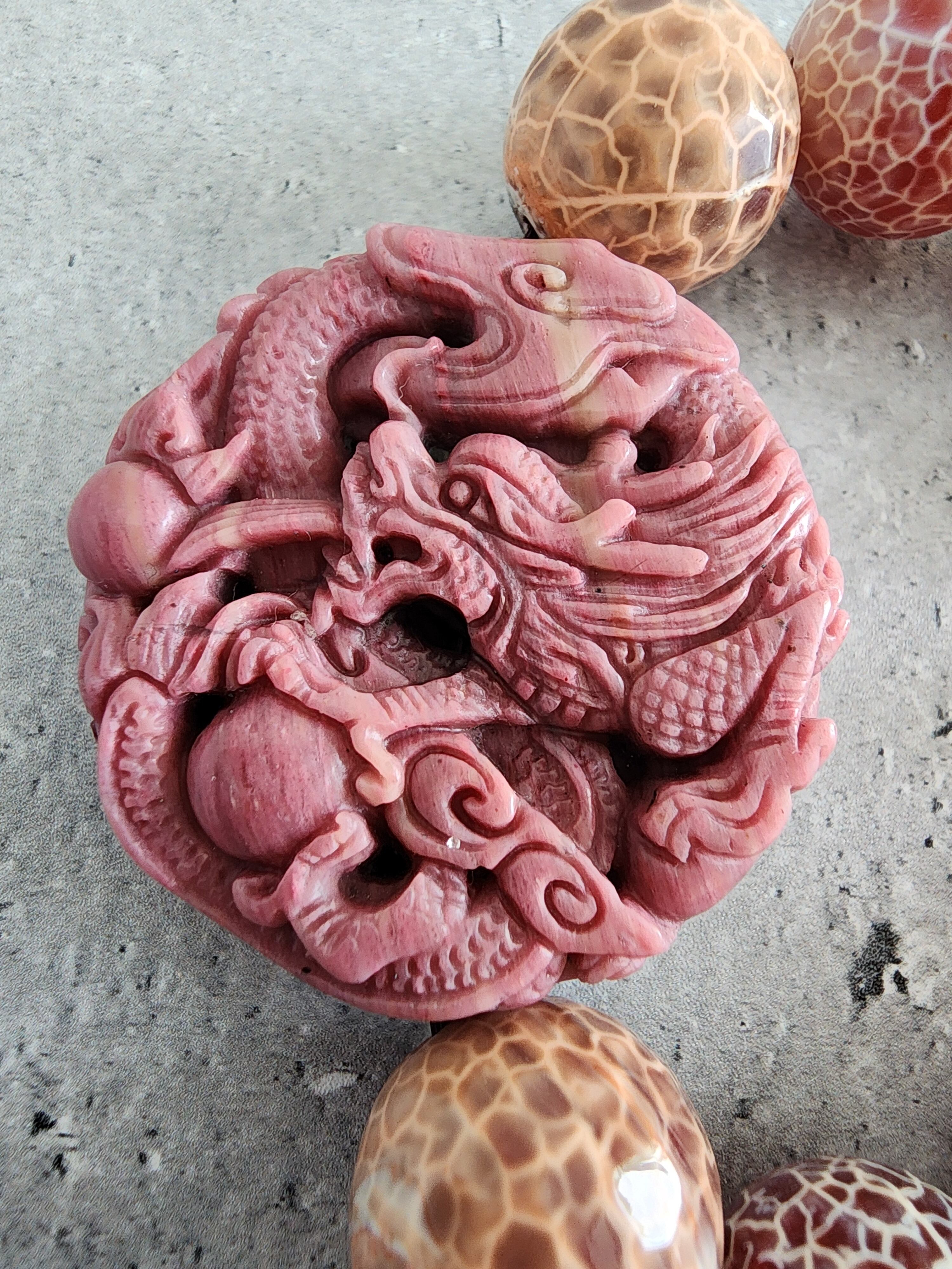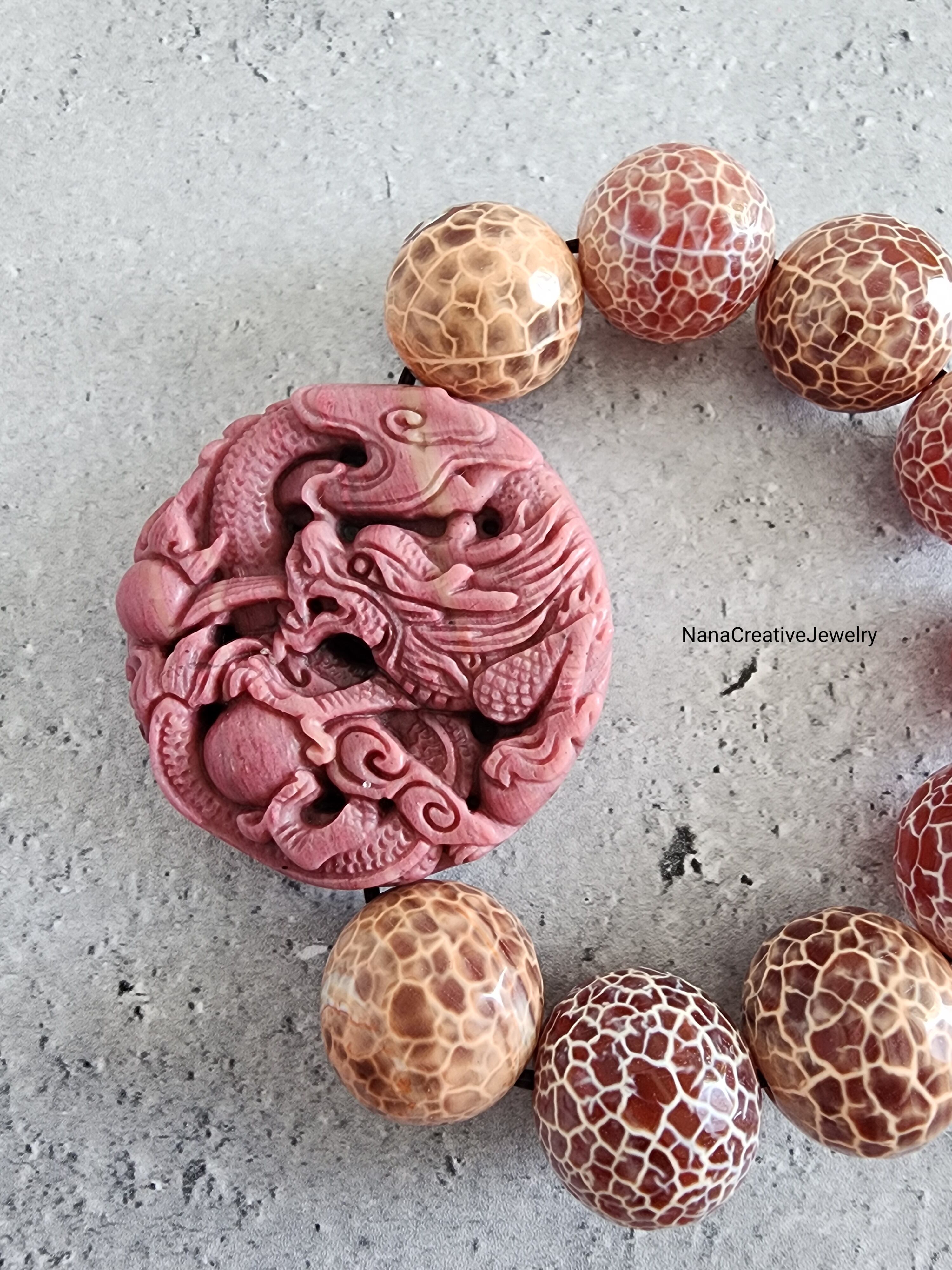 インパクト感抜群の龍神様が生き生きと彫刻されているピーモンタイトが18cmの大粒ファイヤーアゲートに包まれる迫力のあるアイテムです。