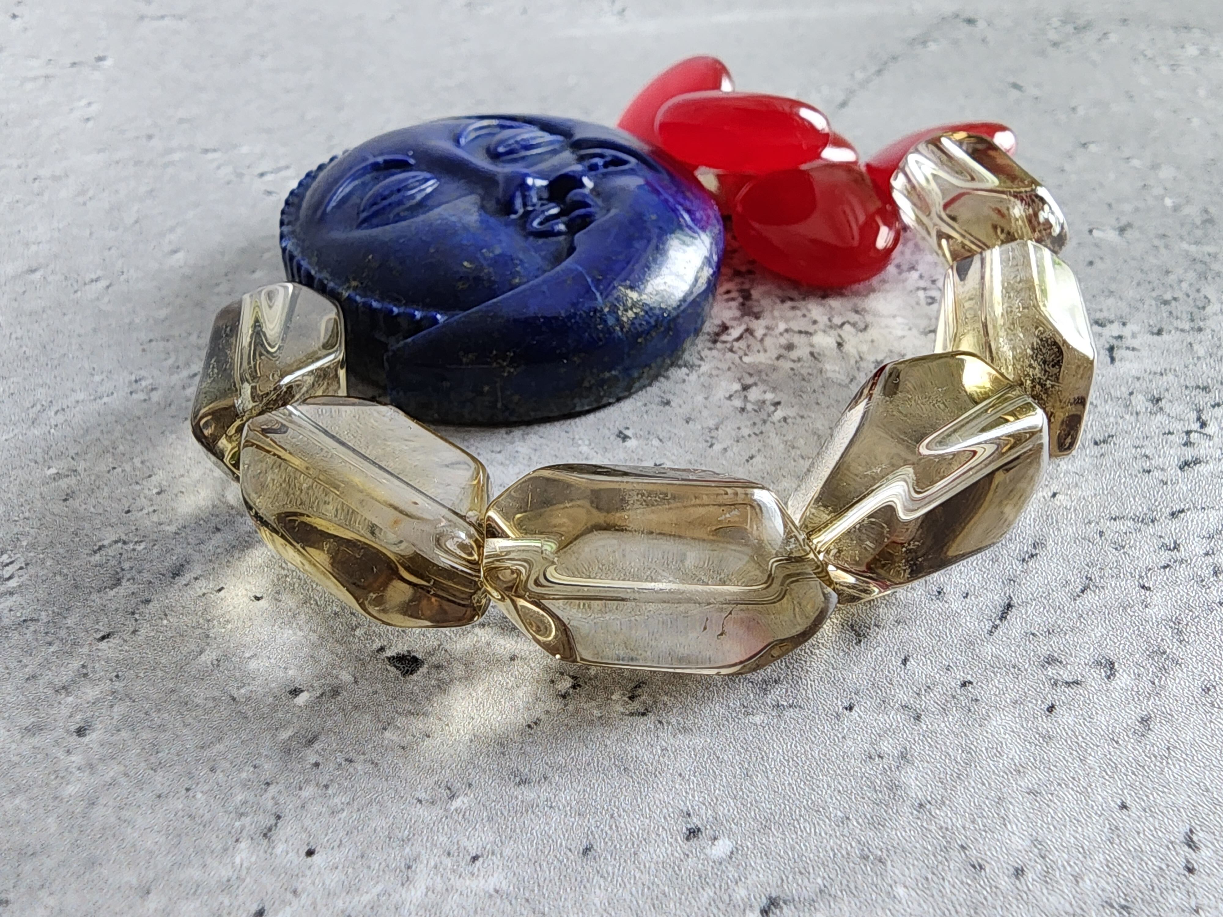 生き生きとした表情のサン×ムーンラピスラズリは陰陽の調和を象徴し、光が溢れ出る上品なウイスキークォーツタンブルカットと花びらのようなレッドジェードを合わせたエキゾチックな雰囲気が魅力的な一本。
