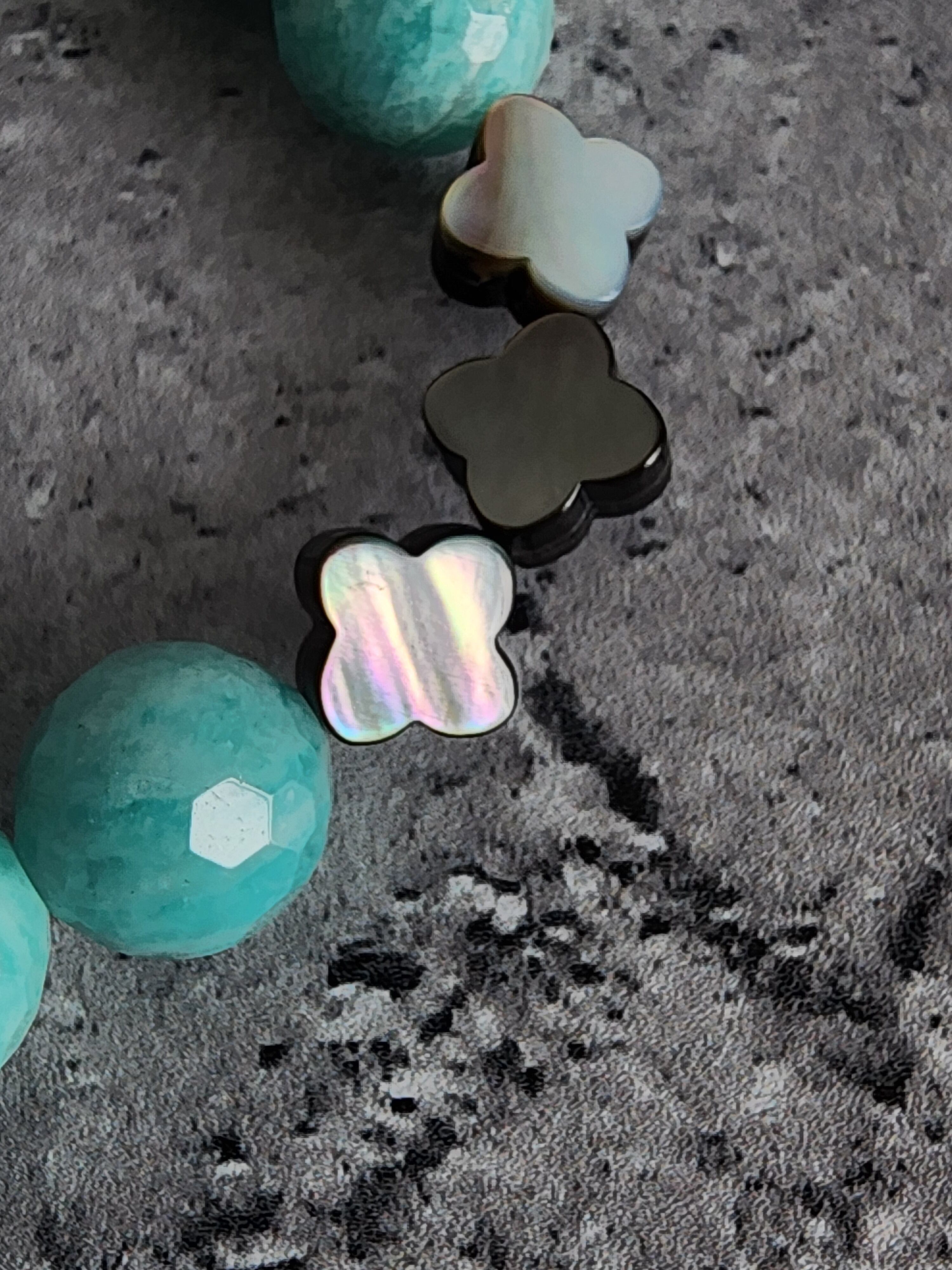 ペルー産アマゾナイト128面カットを合わせて、その美しい輝きとブルーカラーは、トロレアイトの水色と互いに引き立て、愛らしい四つ葉クローバーのブラックシェルを3つ入れることで、蝶々がお花の蜜を吸っているような幻想的な一本です。