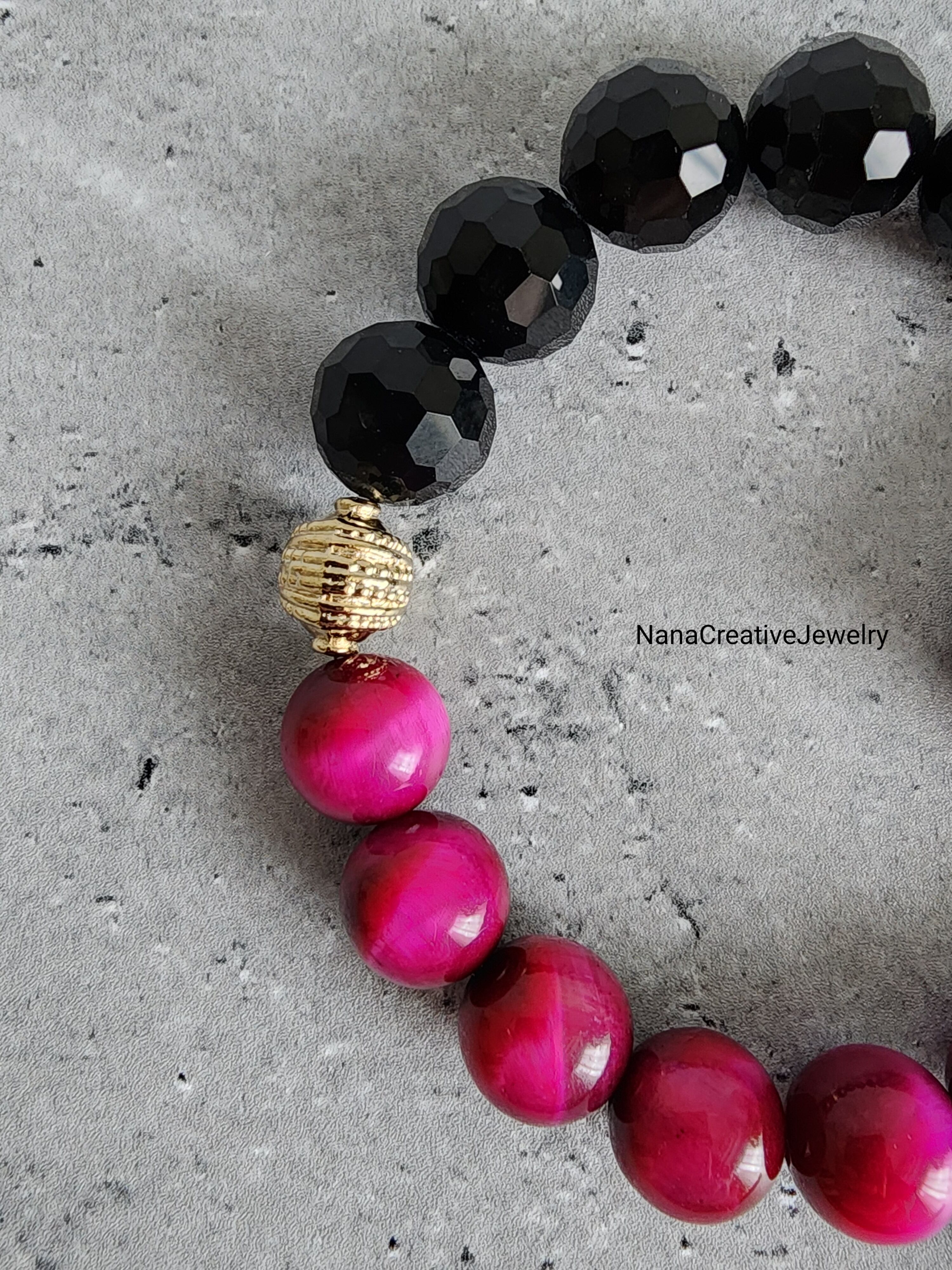 安定的なエネルギーを感じさせるラブラドライト蝶々にカッコいいモリオンのラウンドカット、鮮やかなピンクタイガーを合わせた華やかなムードを放つ一本。ゴールドカラーの金属ビーズをあしらって、よりゴージャスな雰囲気に仕上げました。