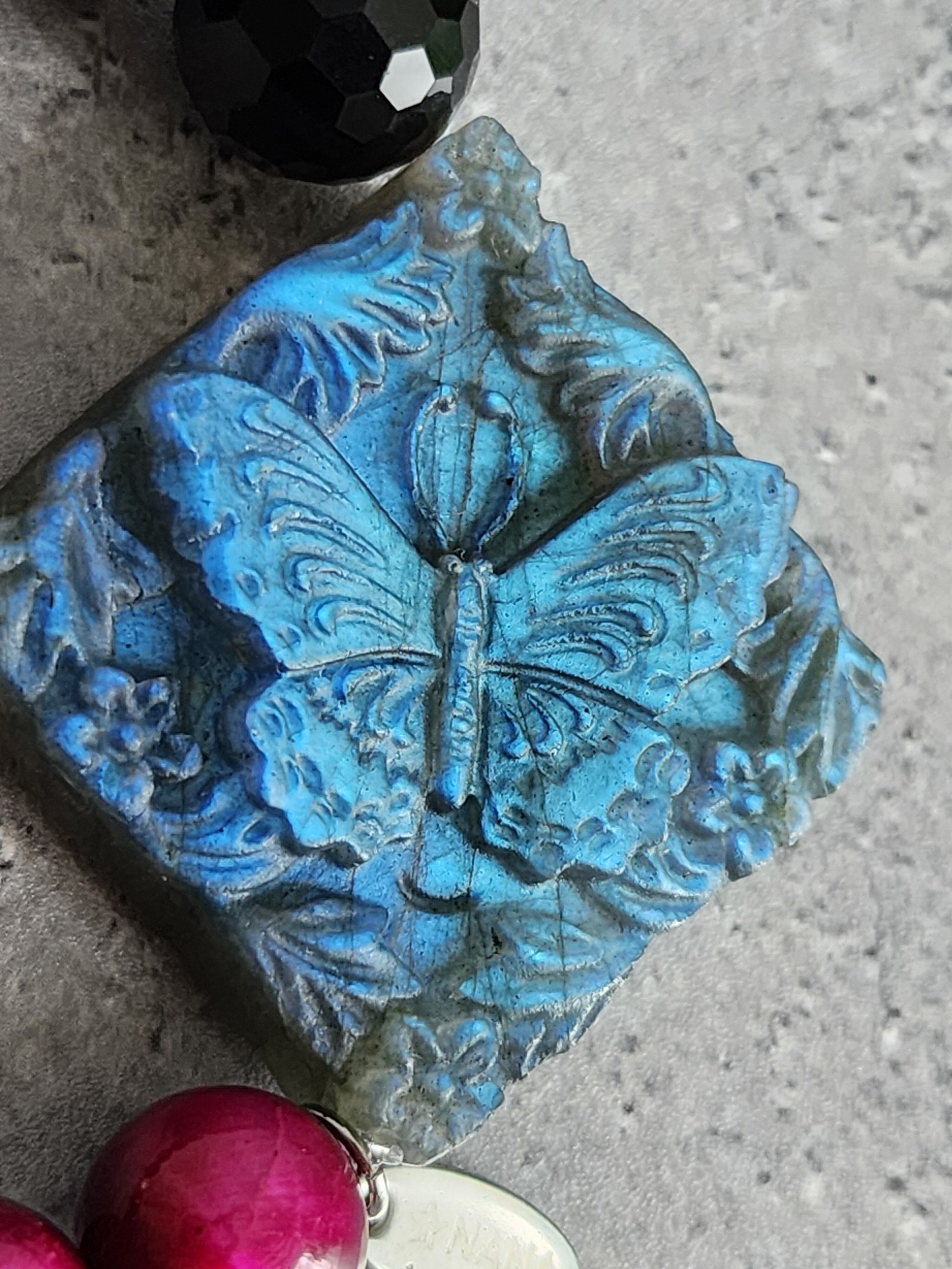 ラブラドライトの蝶は神秘的なブルーカラーのシラーを放ち、どの角度からも眩い美しさをご覧になれる極上な一品です。