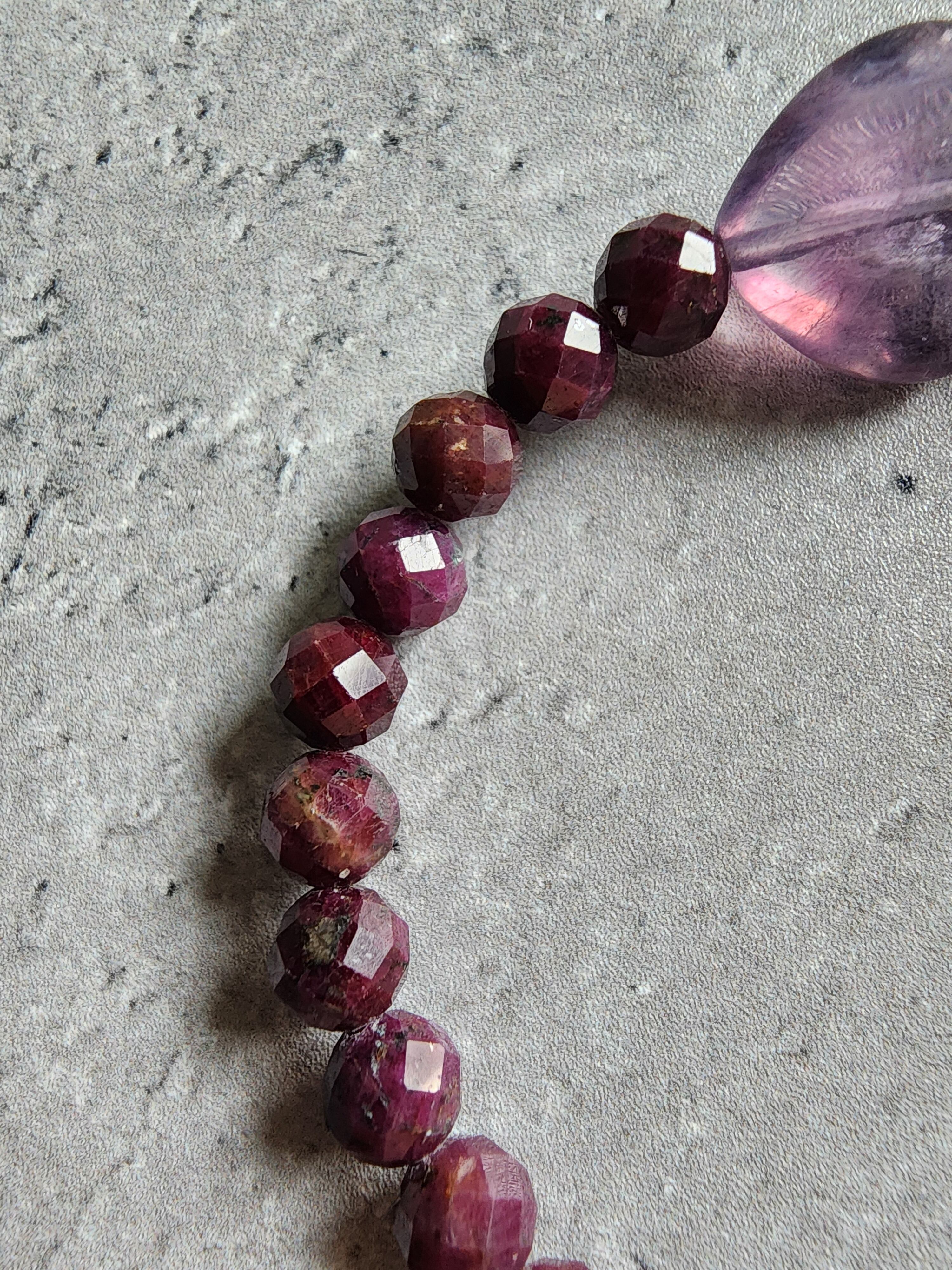 深みのあるパープルがかった色合いとカットの反射が美しく、ルビーの情熱的な赤とフローライトの優しいグラデーションが見事に調和しています。