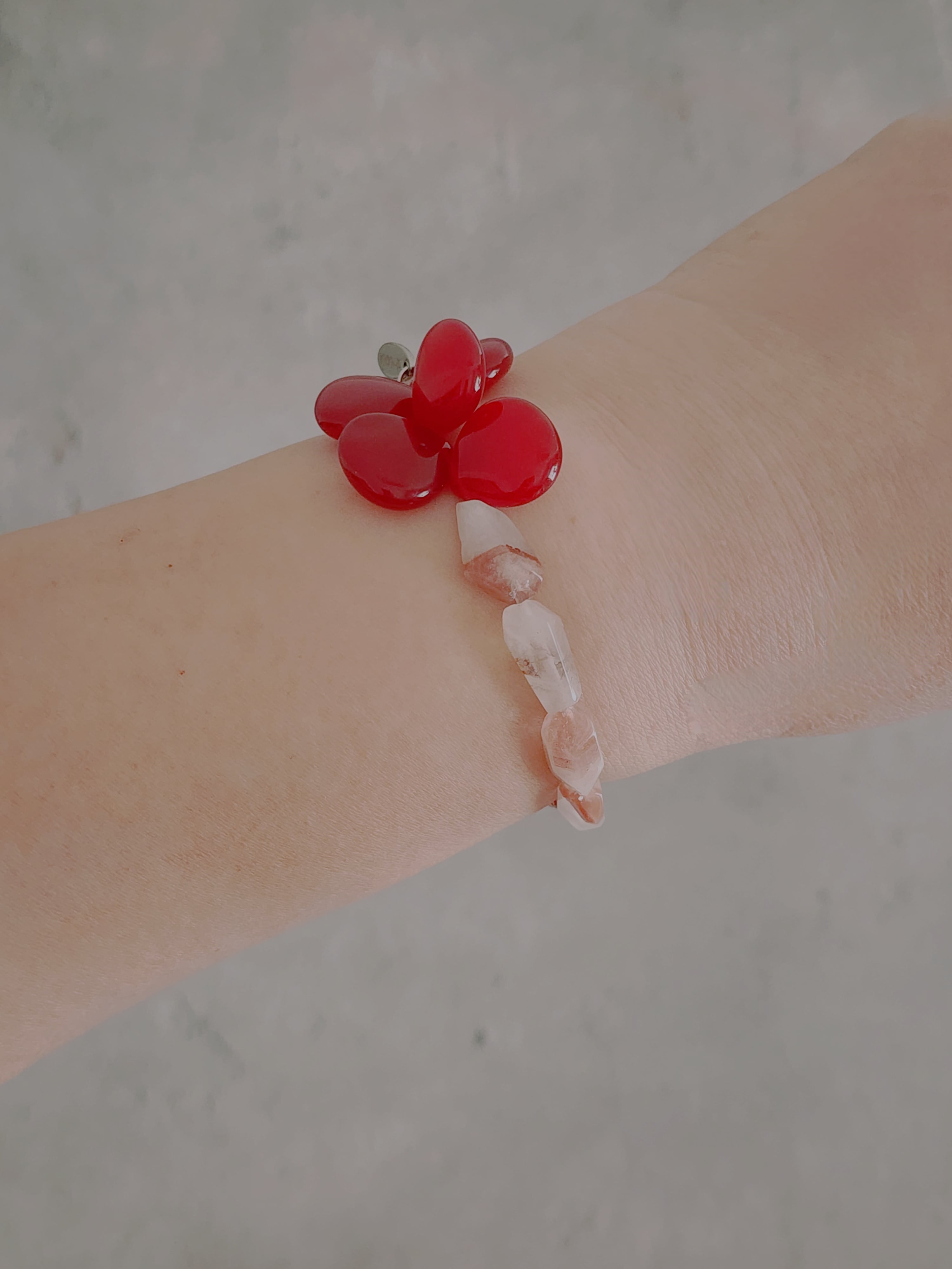 レピドクロサイトインクォーツの透明感と内包された赤い輝きは、夕陽が湖面に映り込む瞬間。レッドジェードの深紅の色合いは、秋の紅葉が山々を彩る様子を彷彿させ、その温かみのある色調が手元に優雅さと気品を添えます。