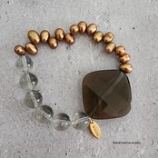 存在感と上品なカットを誇る菱形のスモーキークォーツを中心にシックなゴールド光沢を放つ淡水パールとクリア感が抜群の淡いグリーンアメジストのコンビネーション。