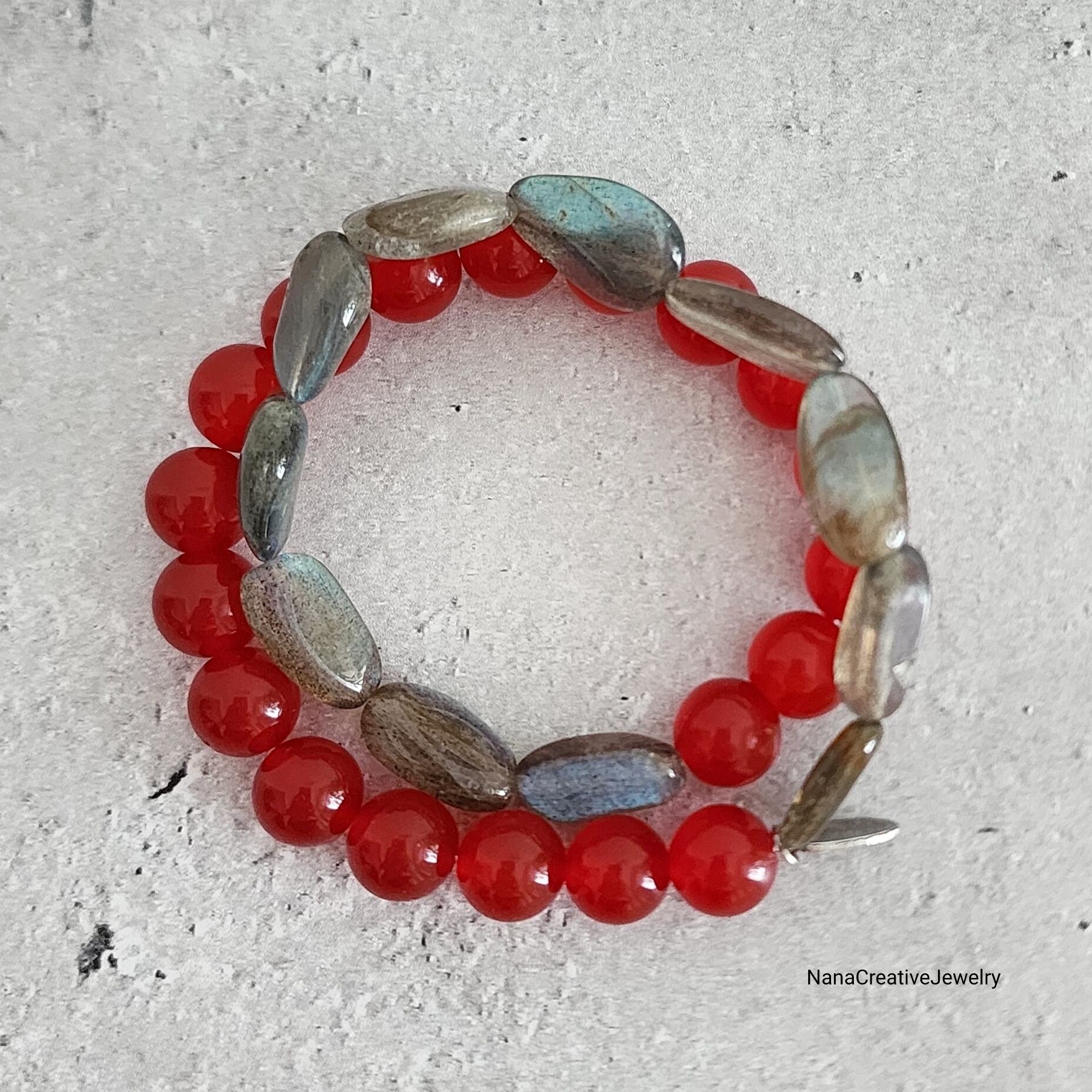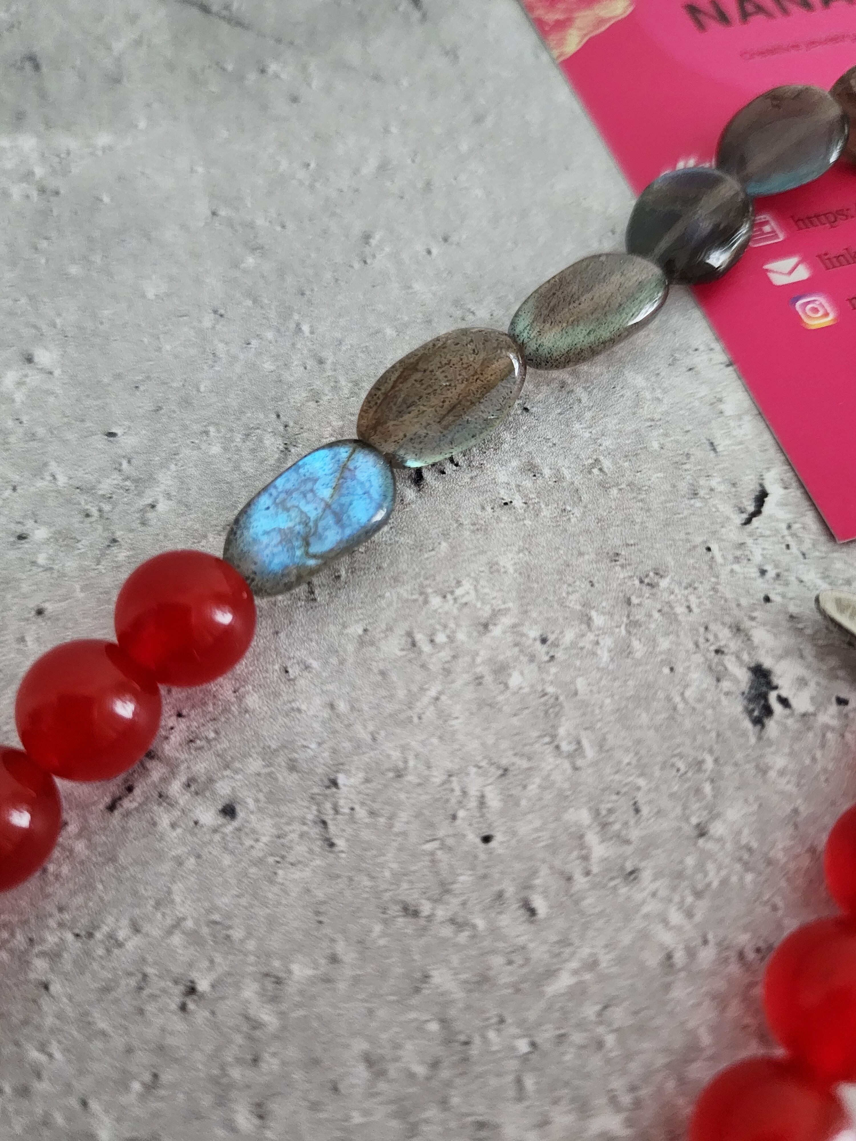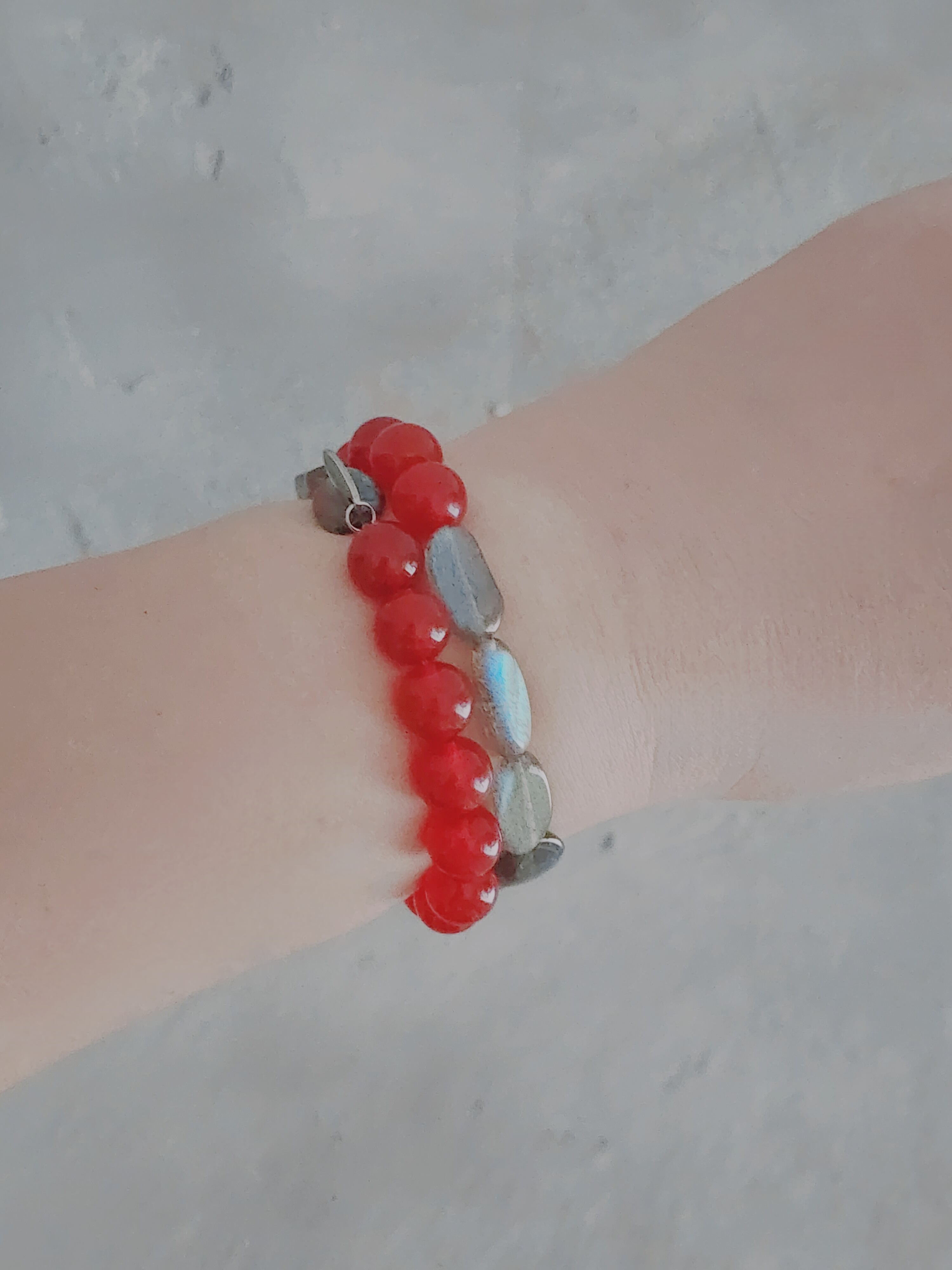 夜空に輝くオーロラが、燃え盛る焚き火の光と共に踊ります。生命力と情熱を表すレッドジェードとその虹色のシラーが、光の角度によって神秘的な色彩を見せる変容と直感を象徴するラブラドライトの相性ぴったりなコンビネーションです。