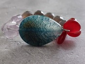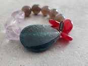 深海のようなブルーに炎のような模様が特徴の優美なファイヤーアゲート、夜明けの空が徐々に明るくなる様子を映し出すアメジストタンブルと穏やかな曇り空を感じさせるグレーオニキスのラウンドカット、レッドジェードの鮮やかなレッドは夏の果実が熟して輝く瞬間のようです。様々なティストのストーンの魅力が生かされた彩りでバランスと調和が取れたアイテムです。