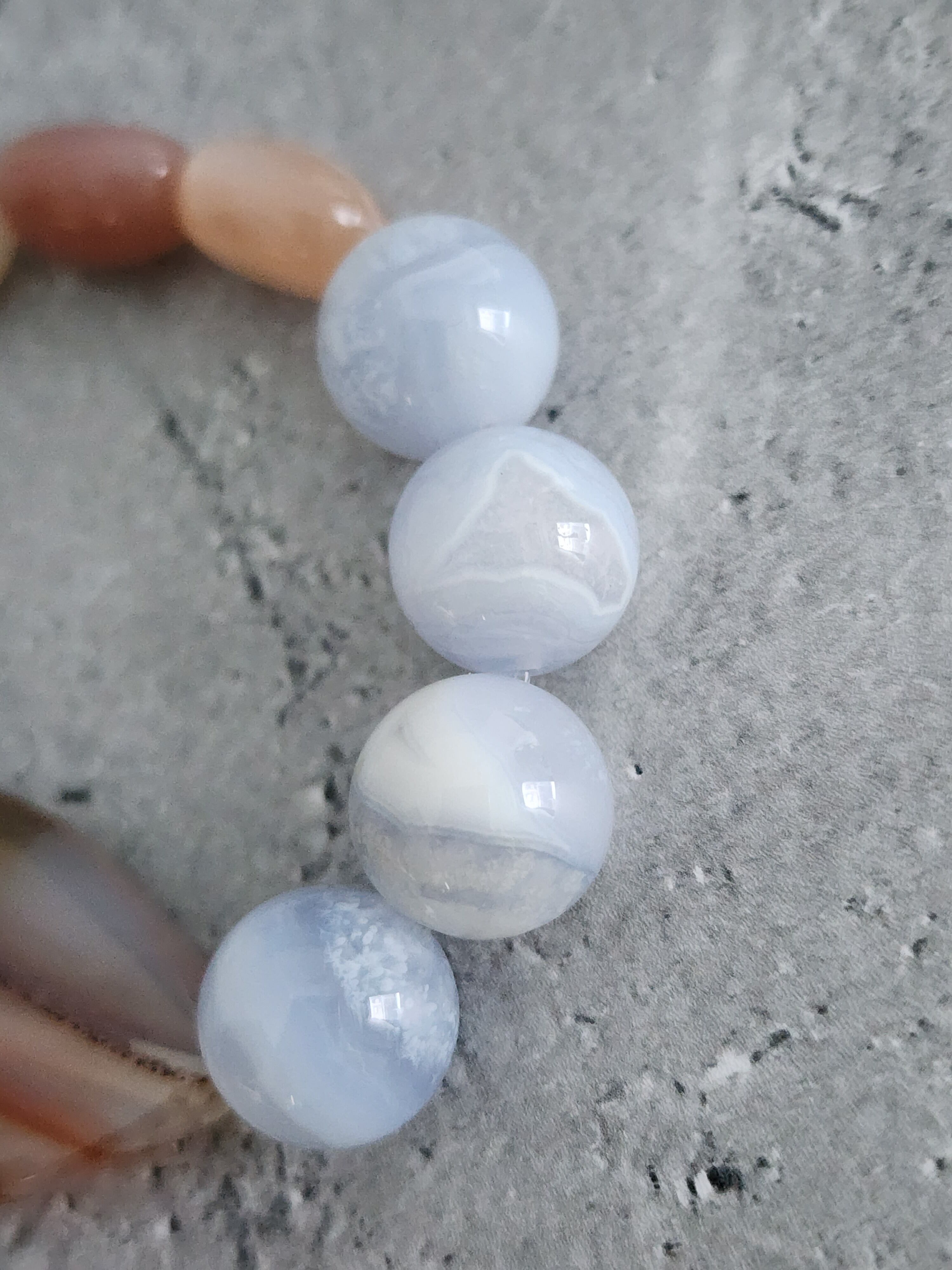 美しいラインが入るしなやかなアゲートを中心に、優美なインクルージョンが穏やかな印象を与えたミルキーブルーレースアゲートと水々しいシラーとゴールドの内包物を持つオレンジムーンストーン、ダイヤモンドのように優雅な光を煌めかせるクリスタルコインで組み合わせた自然の美しさとエレガンスを兼ね備えるアイテムです。