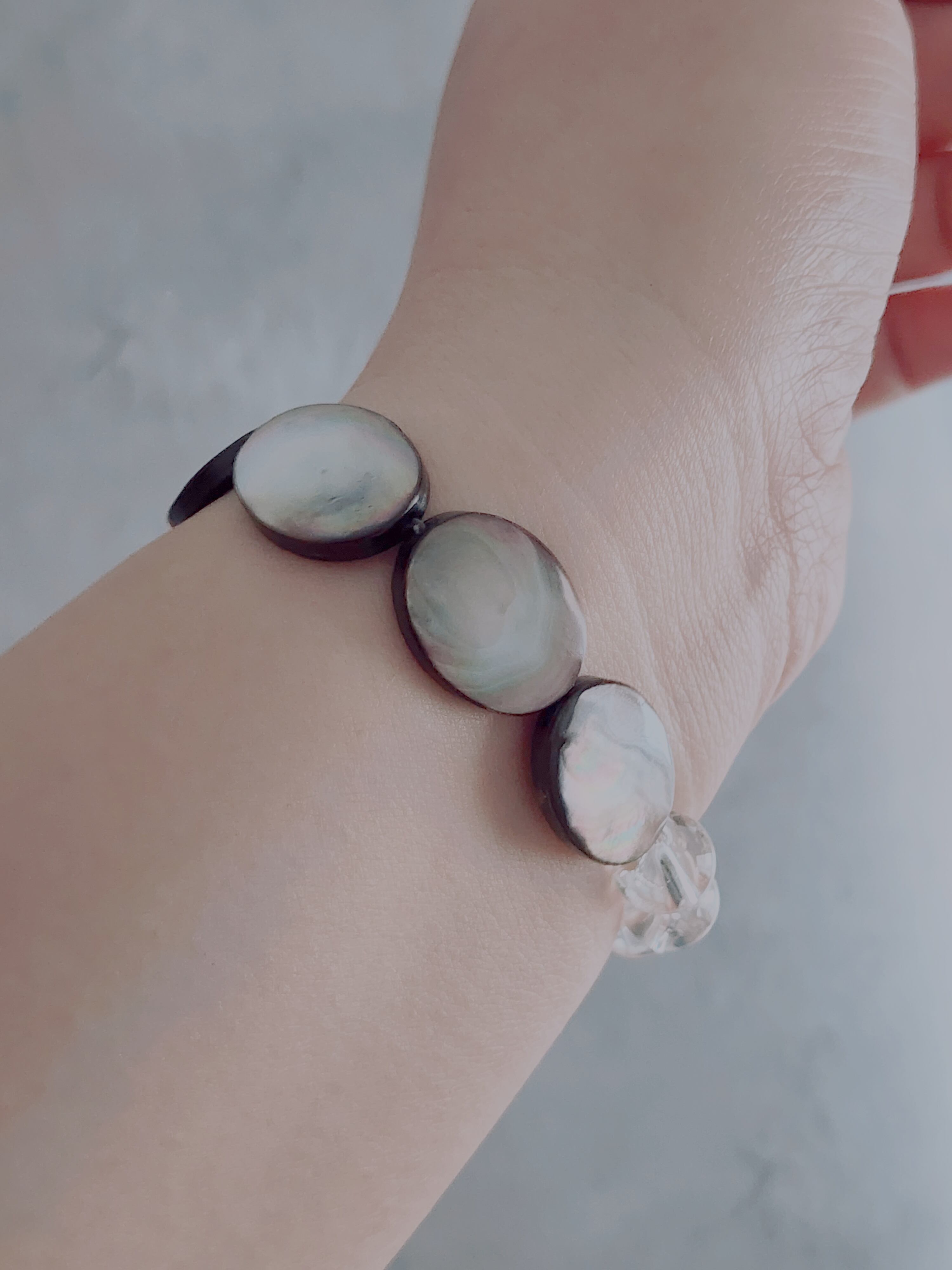 まるで手首に小さな虹を纏っているかのようなアイテムです。アイリスクォーツの透明な輝きは、虹の光が水滴に反射して生まれる美しい光のスペクトルを思わせます。マザーオブパールの虹色の照りは、虹の七色が優雅に混ざり合う様子を彷彿とさせるメルヘンな雰囲気の一本です。