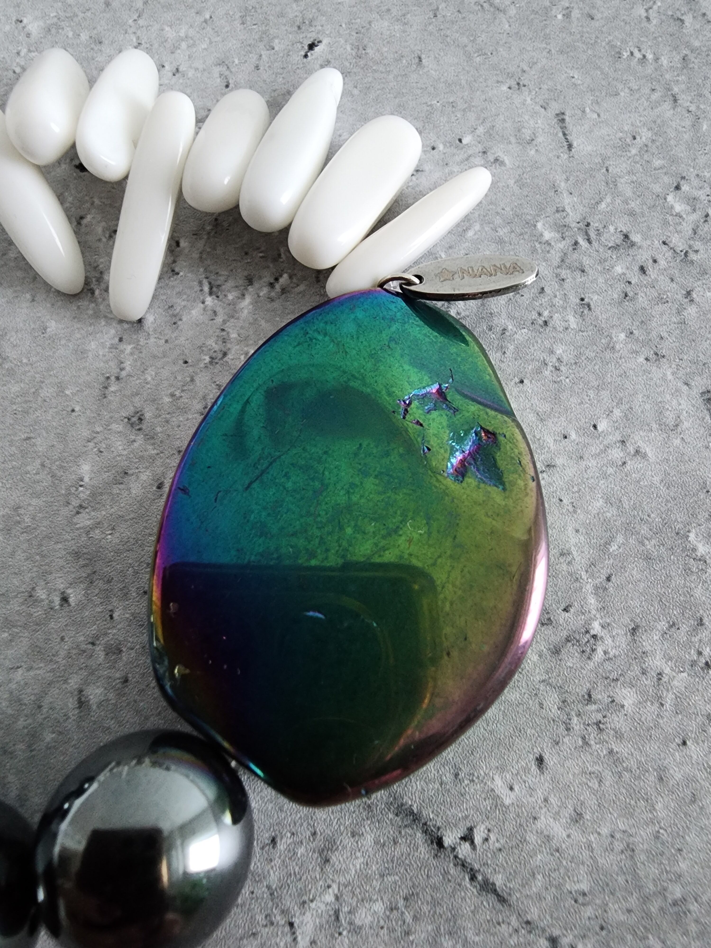 メタリックコーティングされたアゲートは紫や青の虹色の光沢を放ち、視線を引きつけます。ホワイトオニキスは滑らかなタンブル状で、清潔感と落ち着きを感じさせます。大きめのヘマタイトは鏡のような反射面を持ち、全体にシャープでモダンな印象を与えています。
