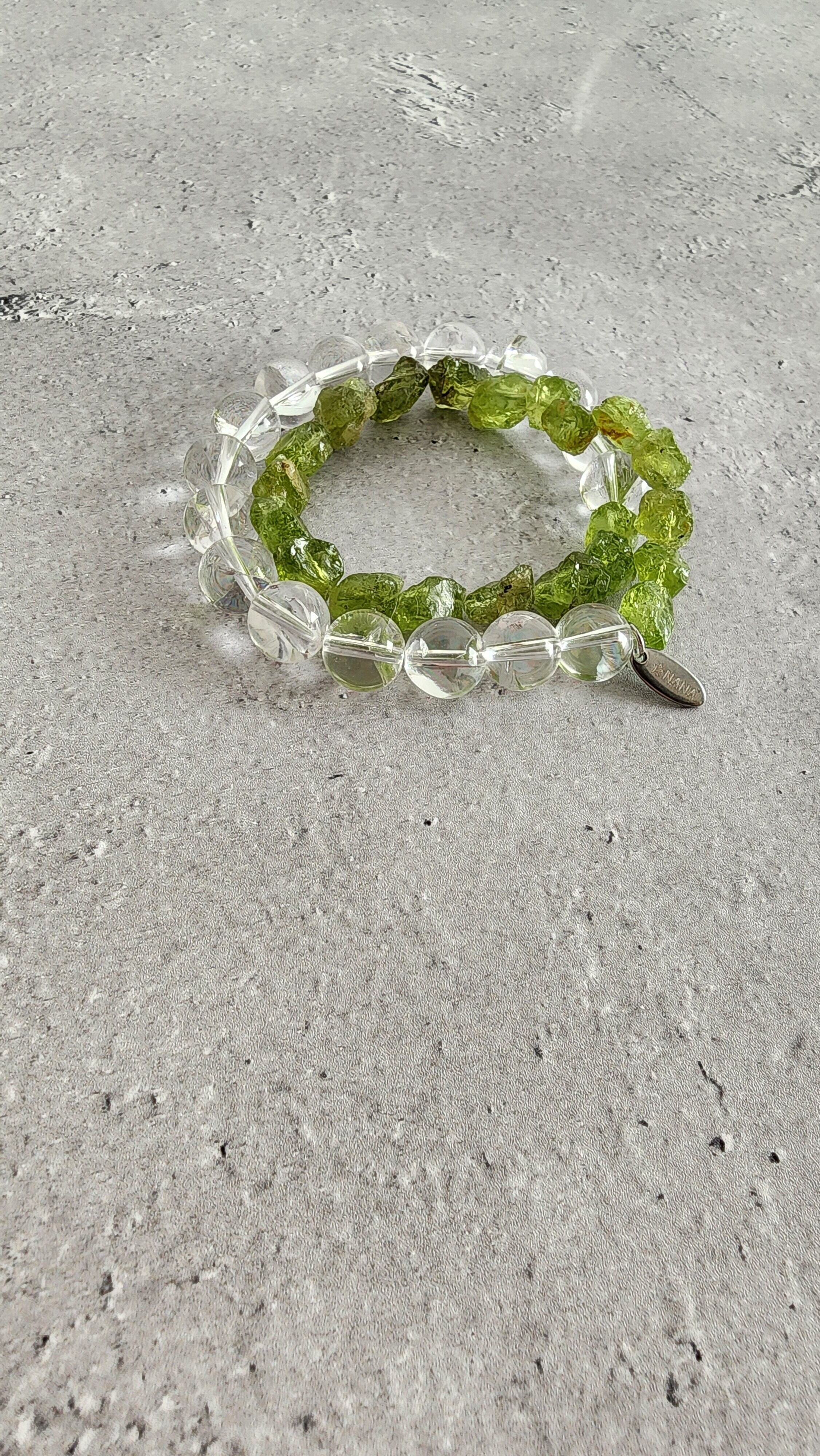 繊細で清らかなアイリスクォーツと原石の魅力をそのまま生かしたペリドットの対照的な組み合わせの二連ブレスレットです。
