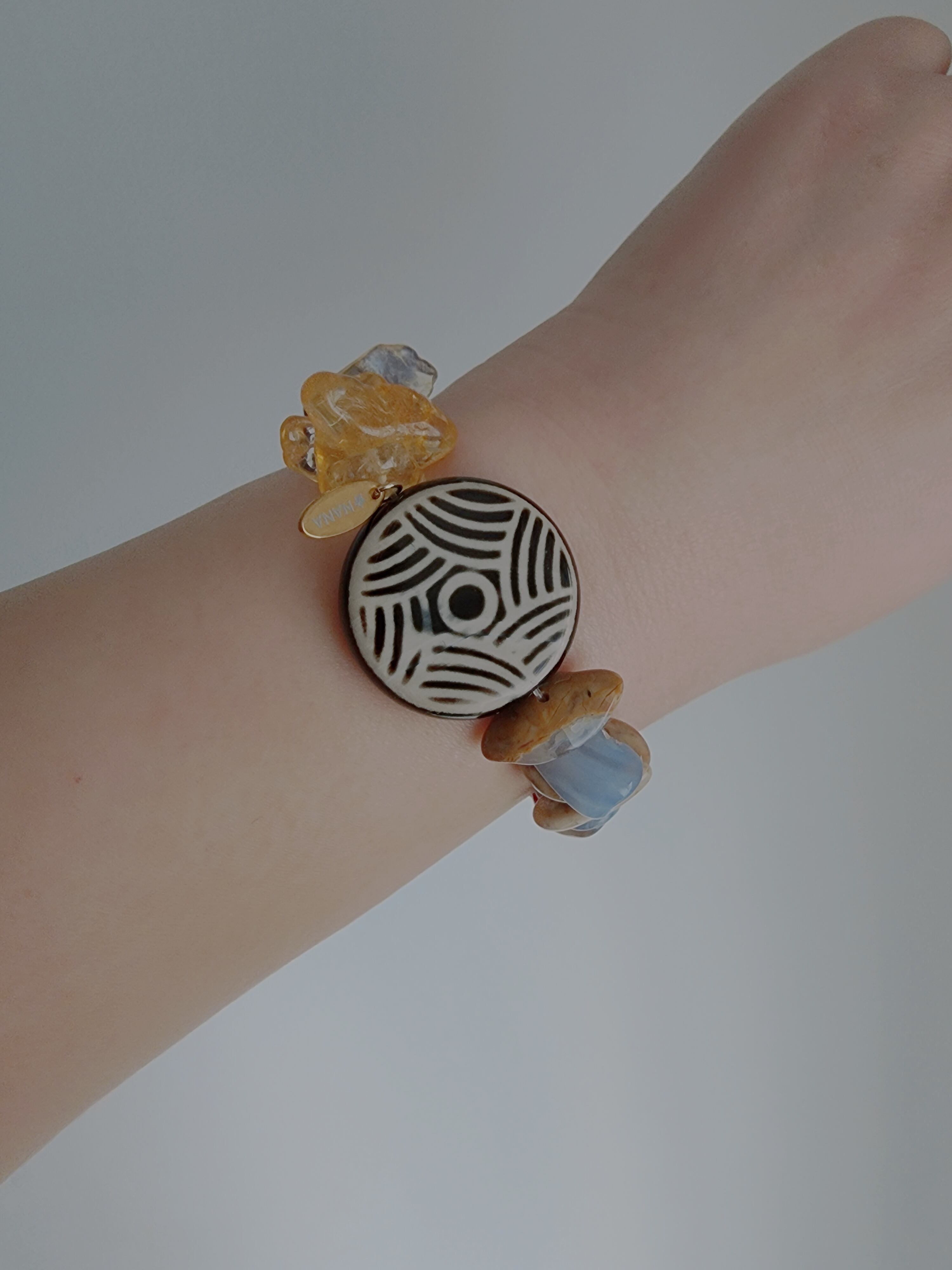 羊眼天珠、チャロアイト、コーラル、シトリン、アメジスト、ブルーカルセドニー、真鍮ビーズ、アクリルビーズで製作されたダイナミックでカラフルなブレスレットです。