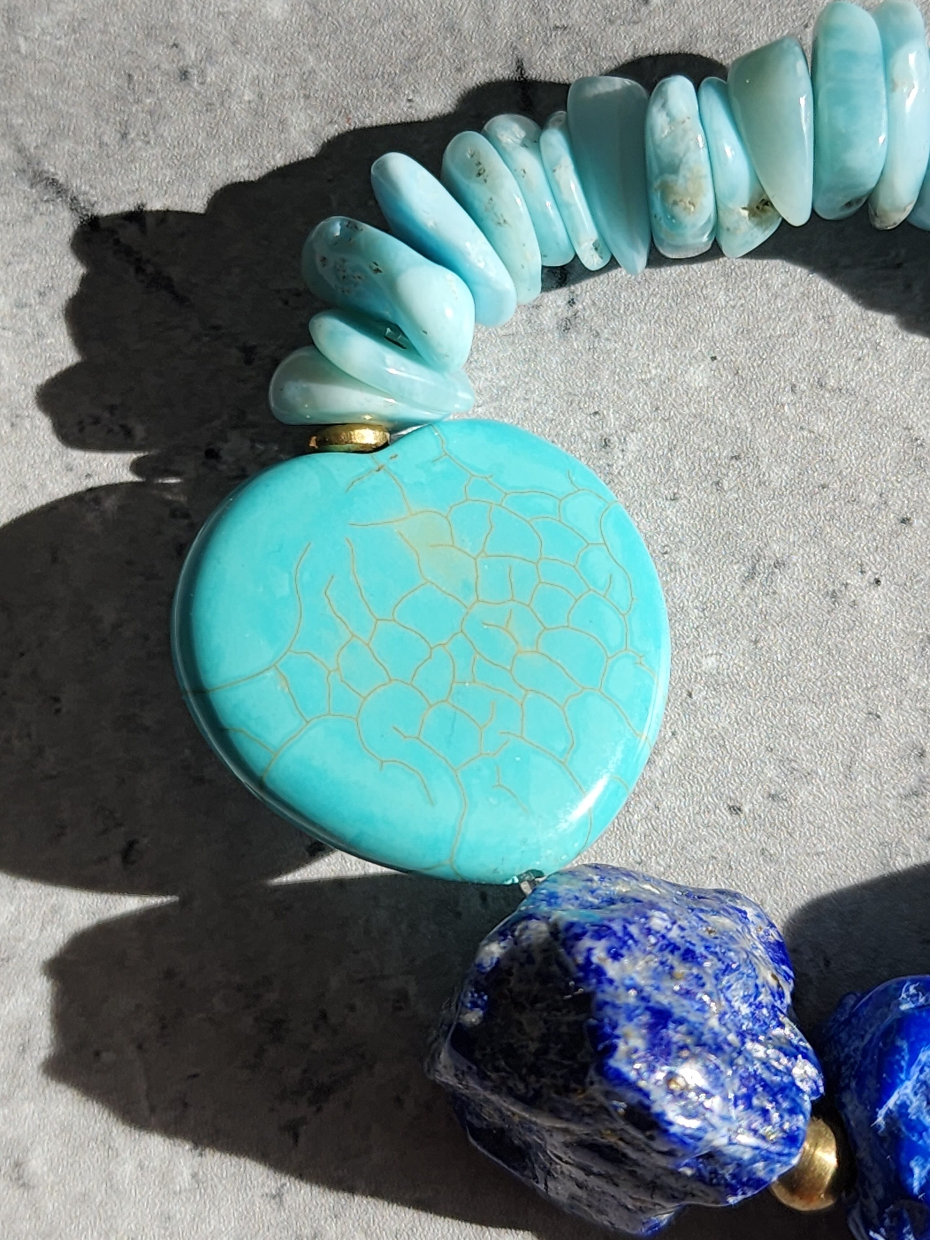 大きなブルーカラーマグネサイトハート、ラリマーチップ、ラピスラズリラフロックと個性的なアフリカン真鍮ビーズの野性とエレガンスを兼ね合わせた一本。