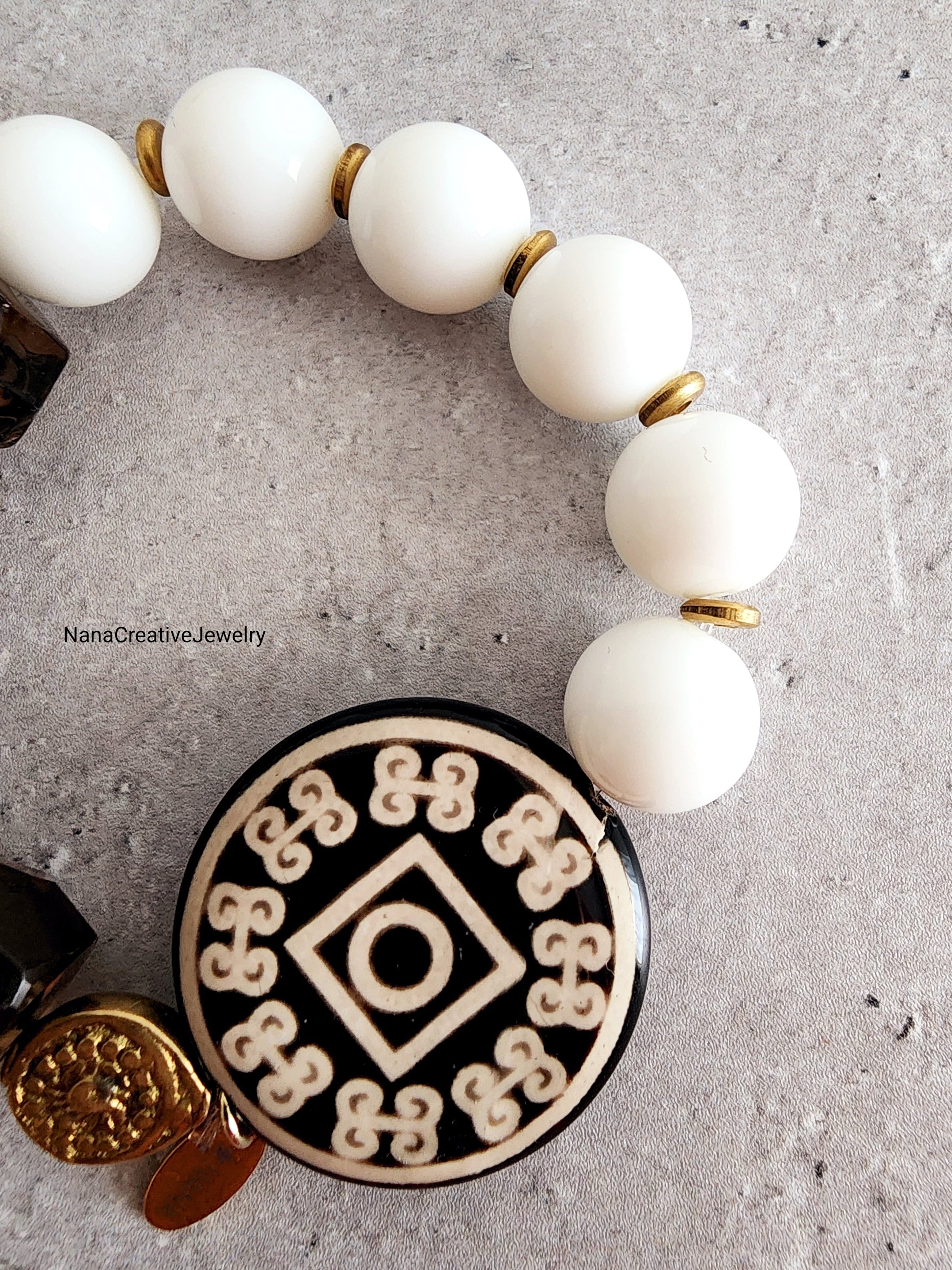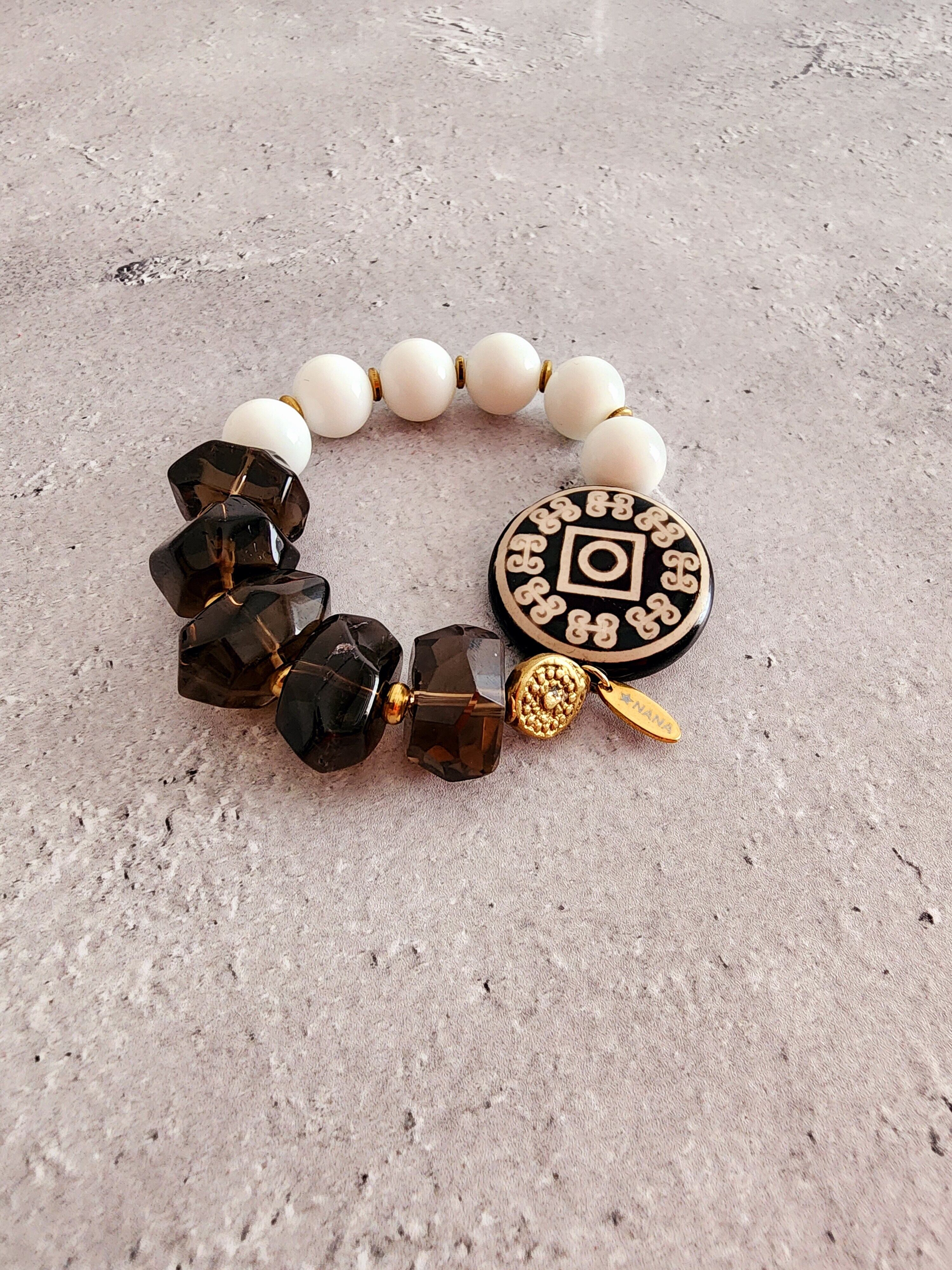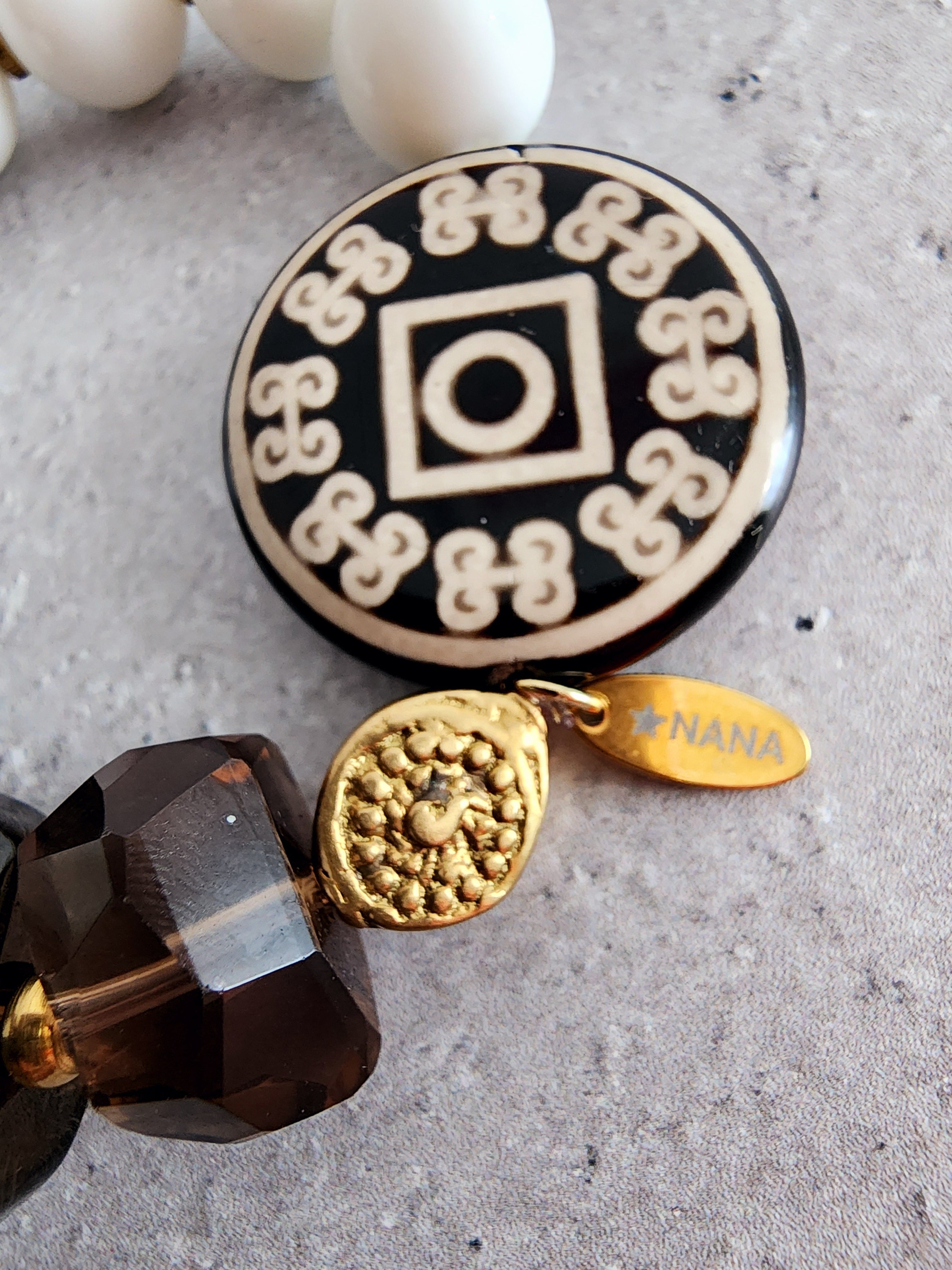 回紋金剛二眼天珠、ホワイトオニキス、スモーキークォーツタンブルを使用し、全体に真鍮のエレメントが組み込まれています。神秘的なデザインとパワフルなエネルギーが融合した一本。