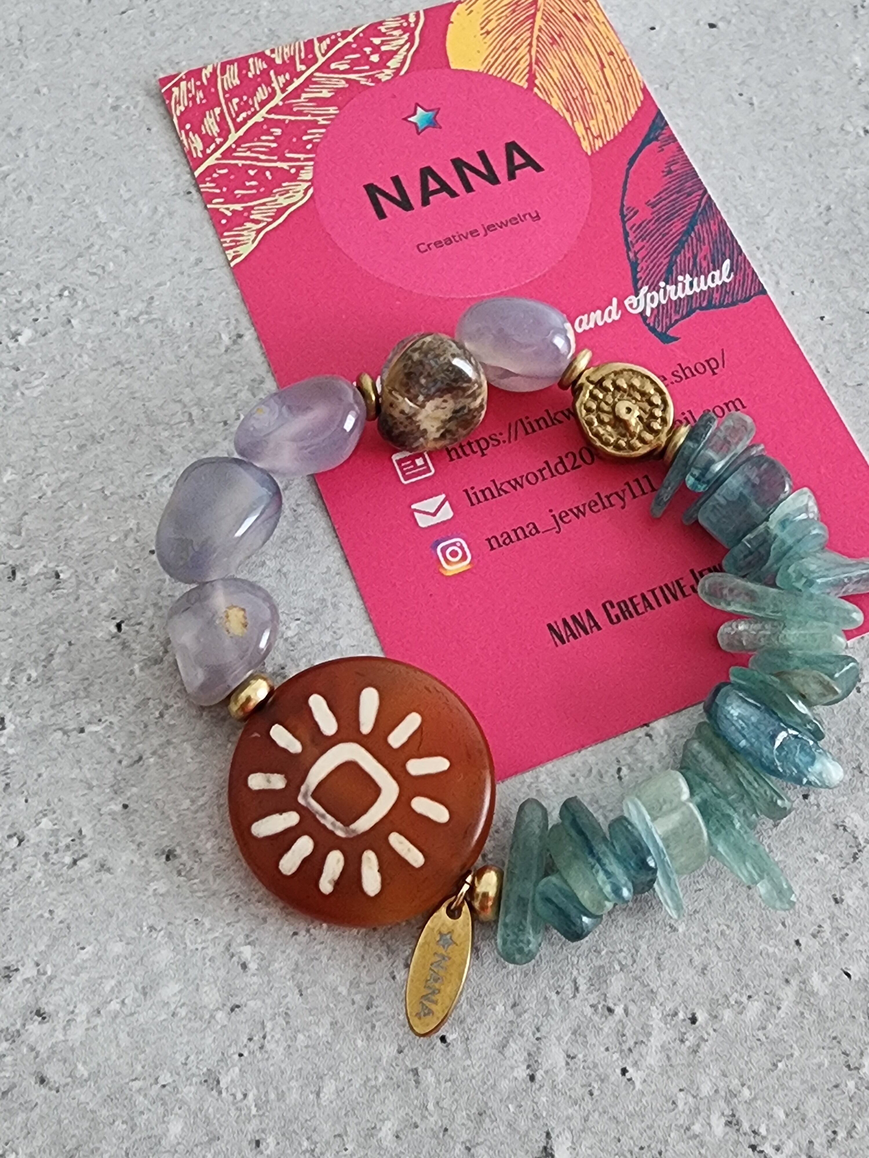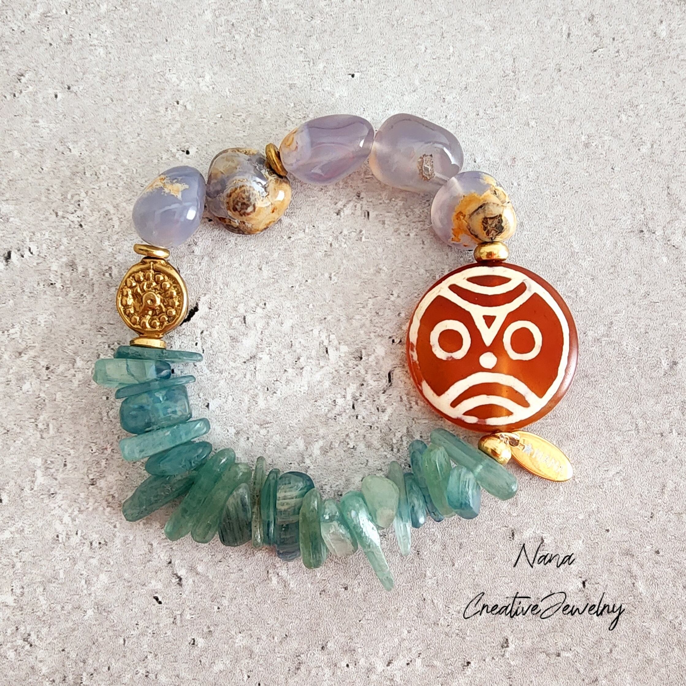 美しい色合いのグリーンカイヤナイト、ブルーカルセドニーのラフロックを使用した心を惹きつける一本。真鍮のエレメントで組み合わされたこのアイテムは、見た目の美しさだけでなく、神秘的なエネルギーを放ちます。