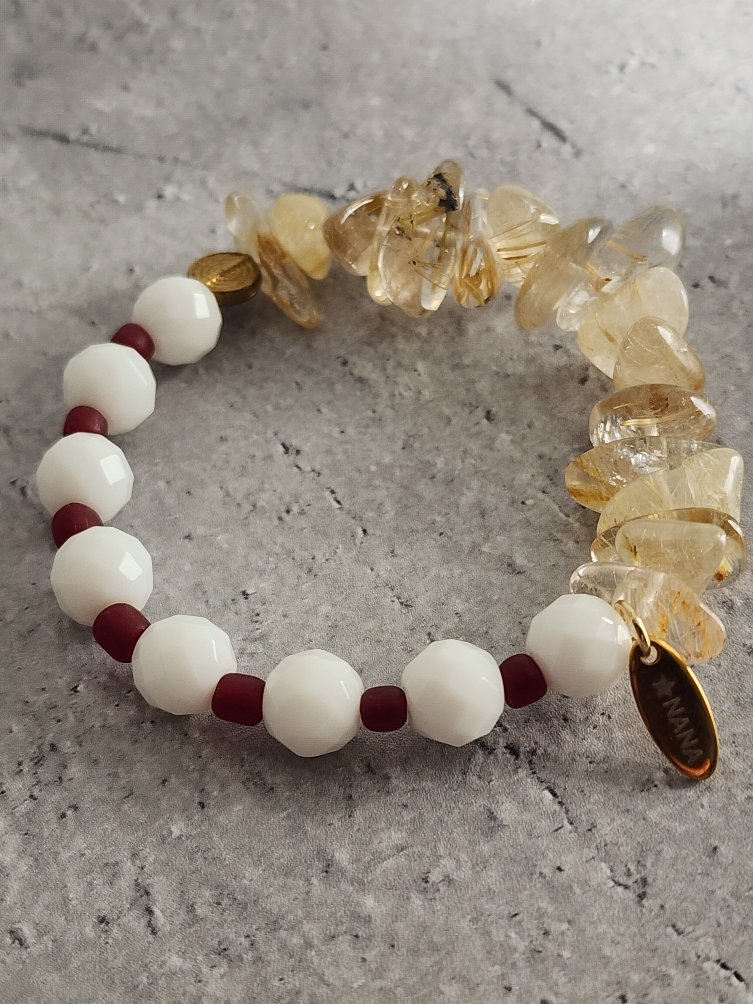 上品なホワイトオニキス多面カットの間にレッドカラーネパールオールドガラスを、そしてユニークな渦模様真鍮ビーズに神秘的なルチルクォーツチップを合わせた洗練された雰囲気のアイテムです。
