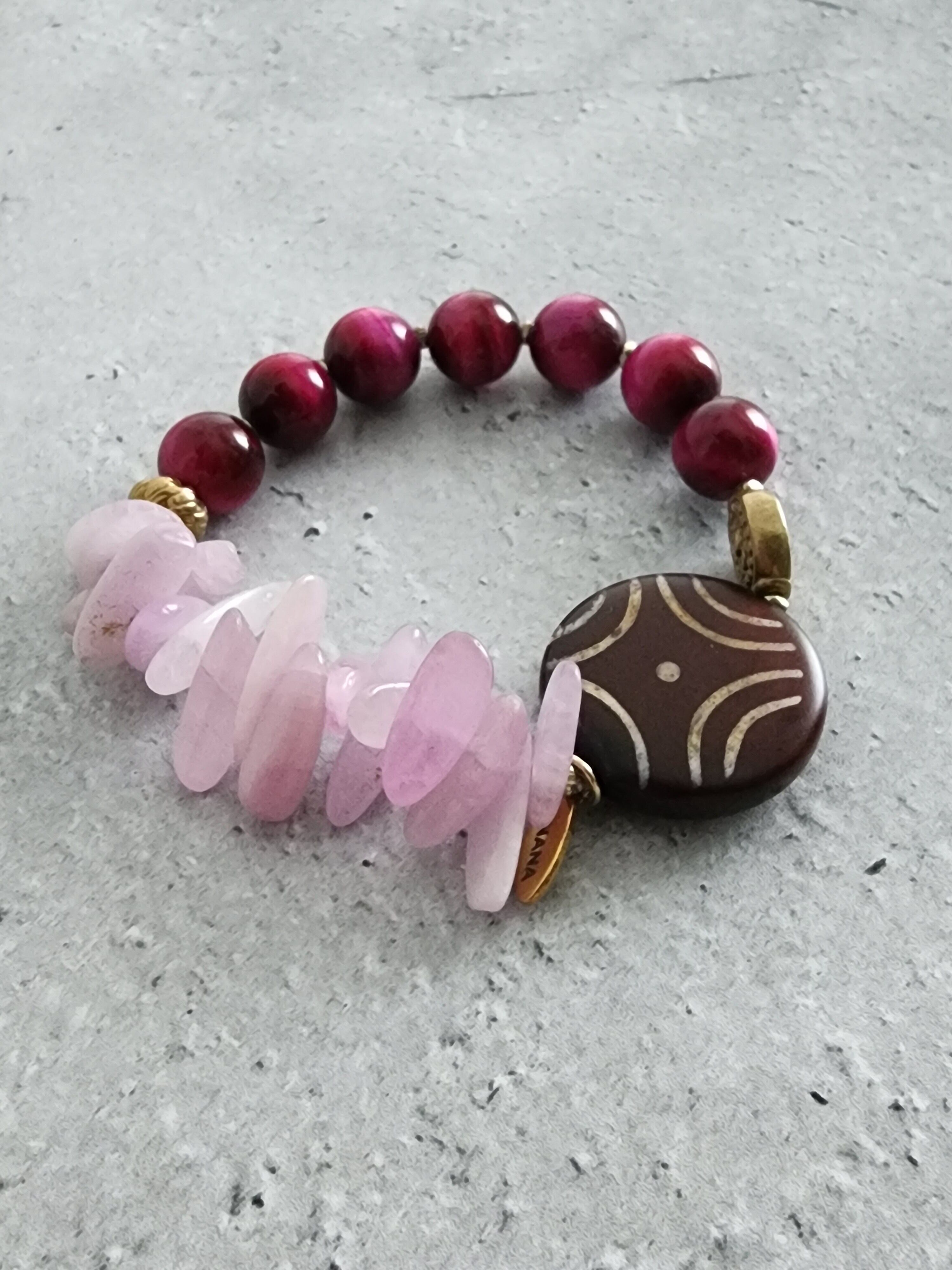 ホルスの目天珠、マゼンタピンクタイガーアイ、クンツァイトチップ、アンティーク風な真鍮ビーズを使用しており、特別なスピリチュアルエネルギーを纏っているアイテムです。ホルスの目天珠は赤瑪瑙です。