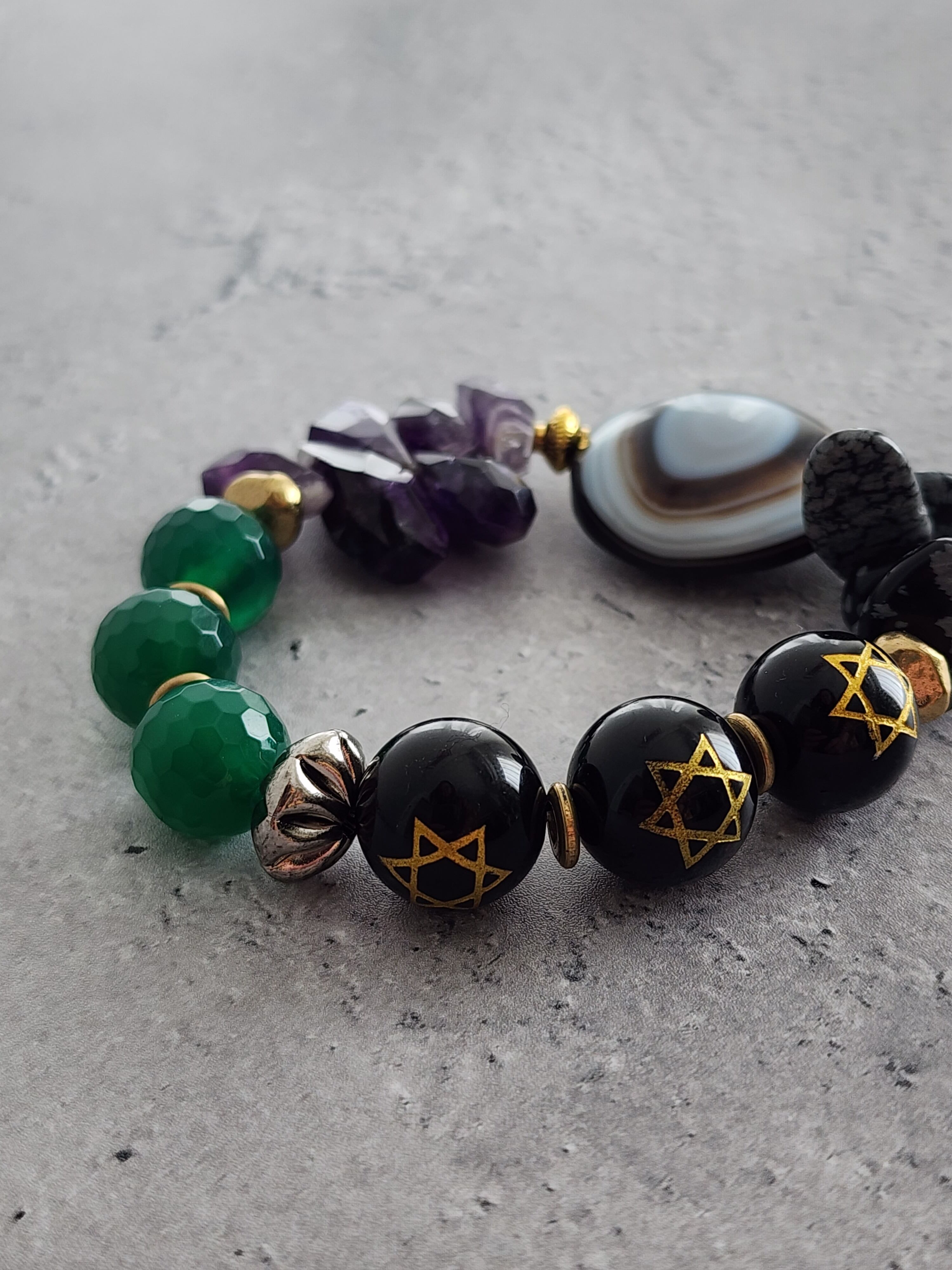 漆黒のオニキスには星のように輝く六芒星が刻まれ、力強いエネルギーを感じさせるデザイン。古くから魔除けや意志の強化に用いられてきたこの石が、ブレスレット全体に神秘的なオーラを纏わせています。ゴールドとシルバーカラーの真鍮パーツがさりげない輝きを添え、落ち着いた高級感を演出。