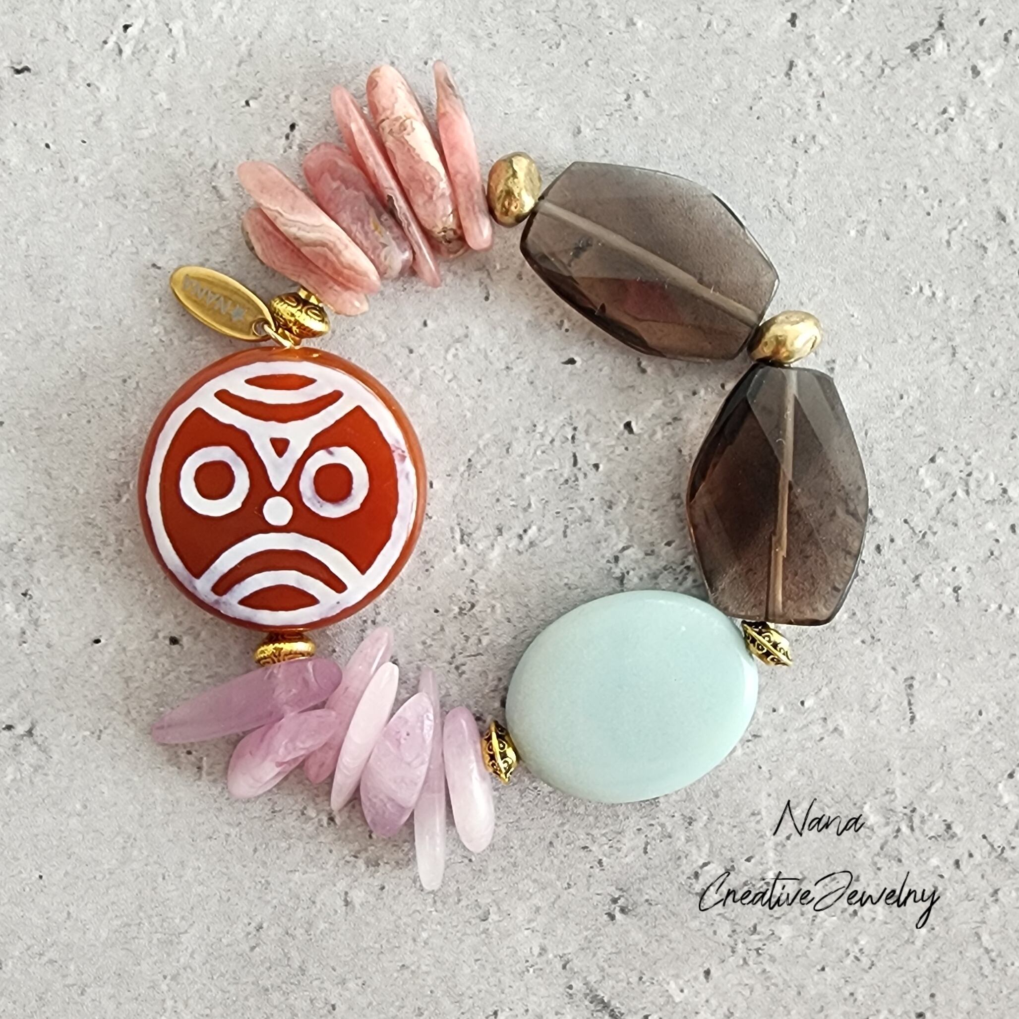 dzi four eyed tiger tooth(四眼虎牙天珠×インカーローズ×スモーキークォーツ×アマゾナイト×クンツァイト×真鍮)