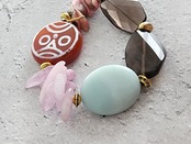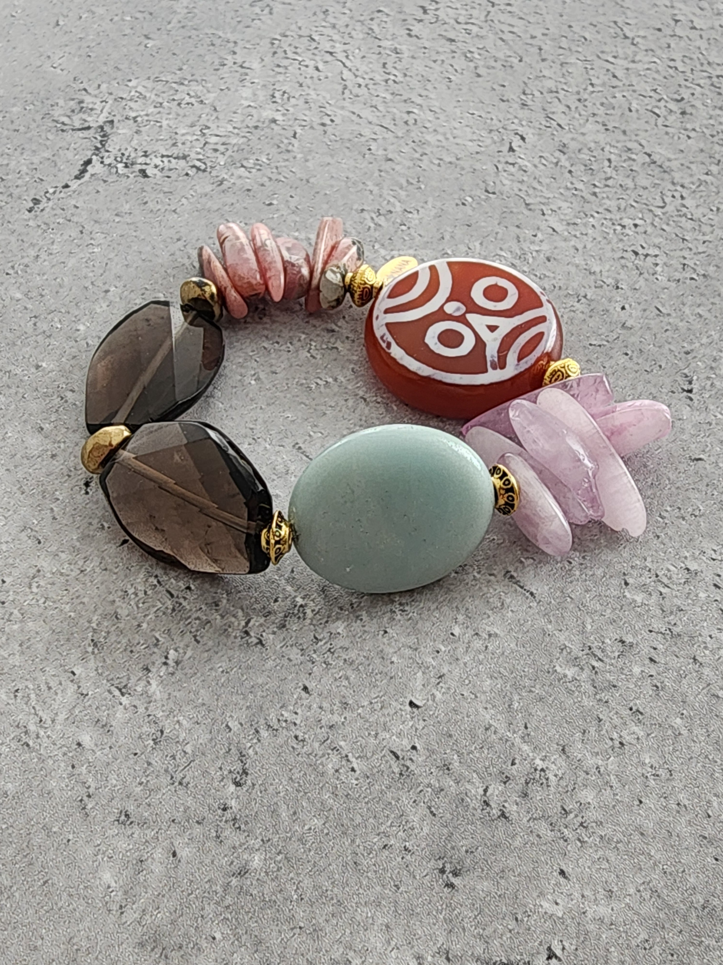 目を引く四眼虎牙天珠を囲むのは、異なる質感と色彩が織りなす絶妙なバランス。スモーキークォーツのシャープなフォルムがクールな印象を加え、透明感のあるスモーキーな輝きが、光の角度によってさりげなく表情を変えます。一方、アマゾナイトの滑らかなオーバルシェイプが、柔らかなコントラストを作り、落ち着きのある品格を演出。